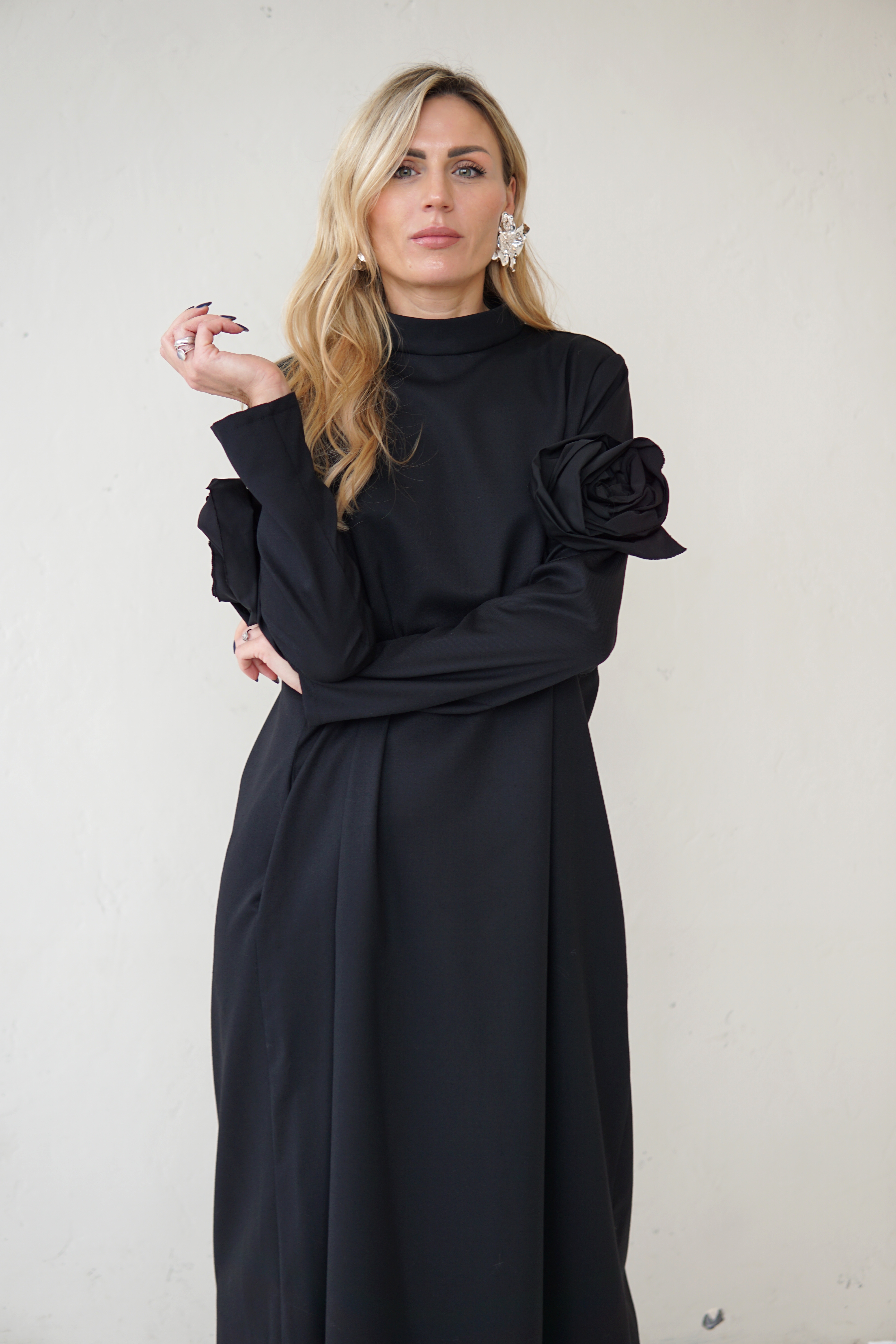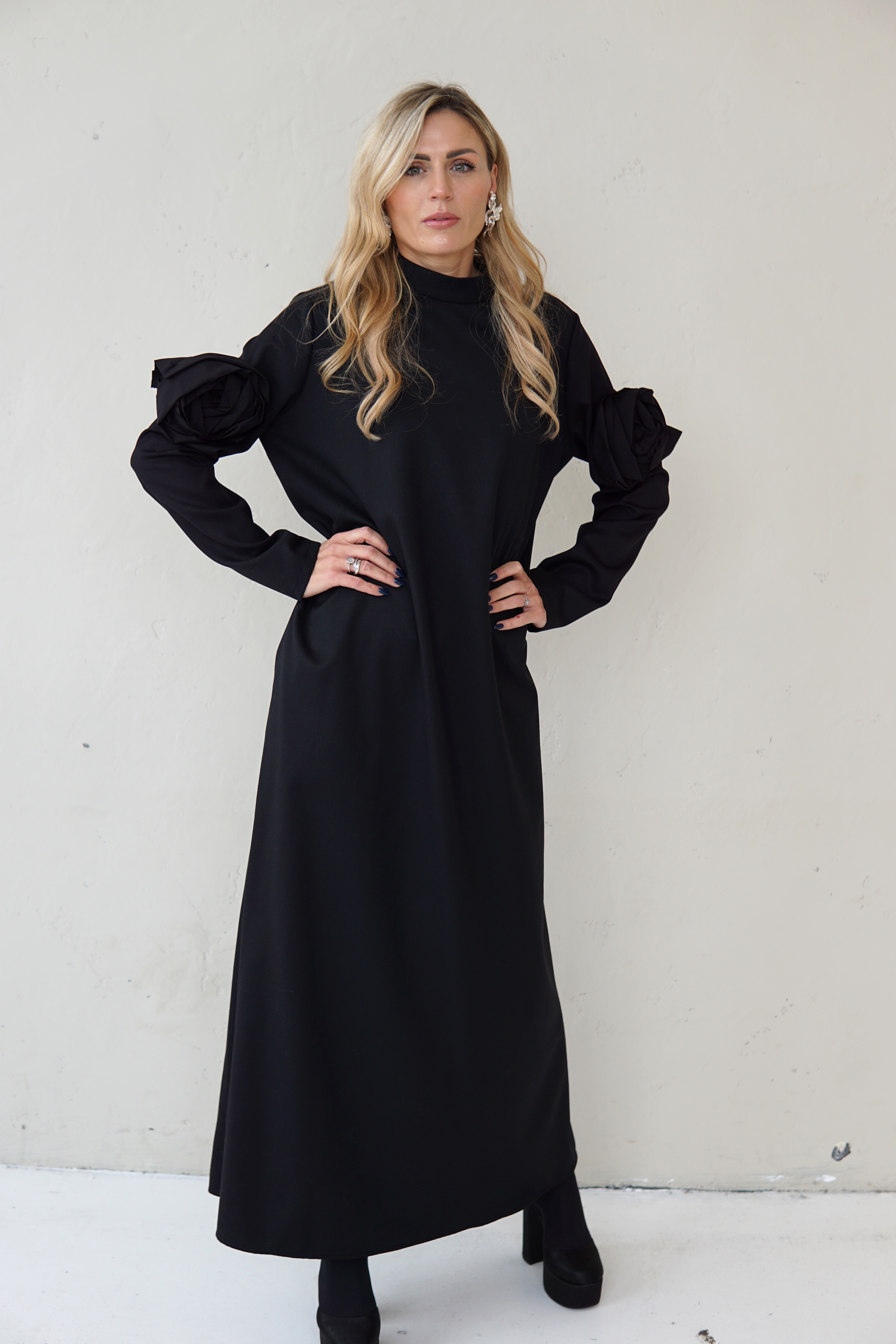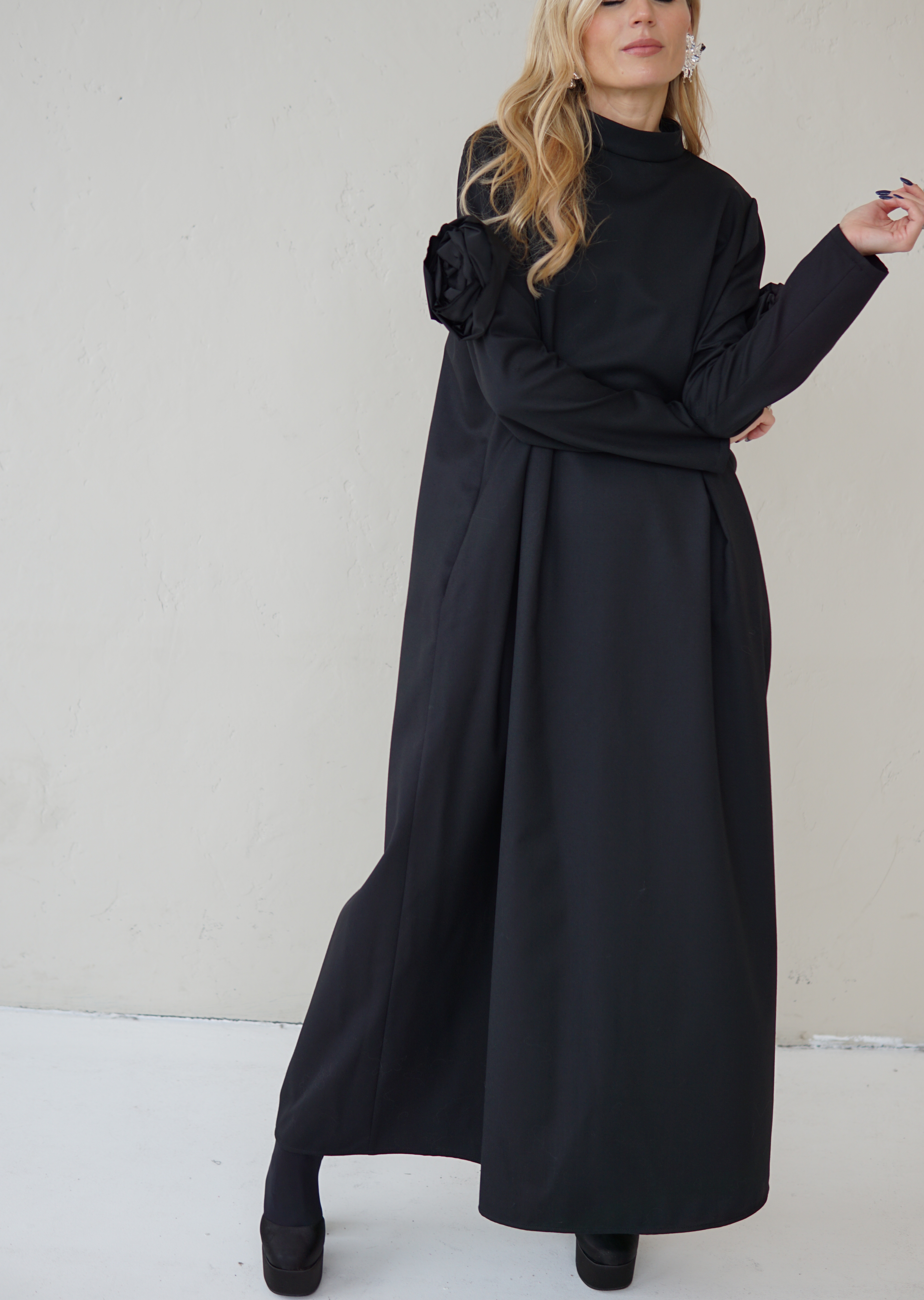 This is a modern edgy office dress that will suit any figure, send us your measurements and we will make a dress that will perfectly fit your figure. This classic womenswear dress is made of luxurious soft wool that falls freely to the ground and flatters your body. This black cocktail dress is long to the ground in a loose silhouette with pockets in the side seam. The evening gown dress is decorated with taffeta flowers on the sleeves, which gives it a luxurious look. The long black couture dress has a high stand-up collar that looks very modern. The dress fastens with a zipper in the back. This dress will be perfect for work or a party. It will express your personality and emphasize your elegance.
