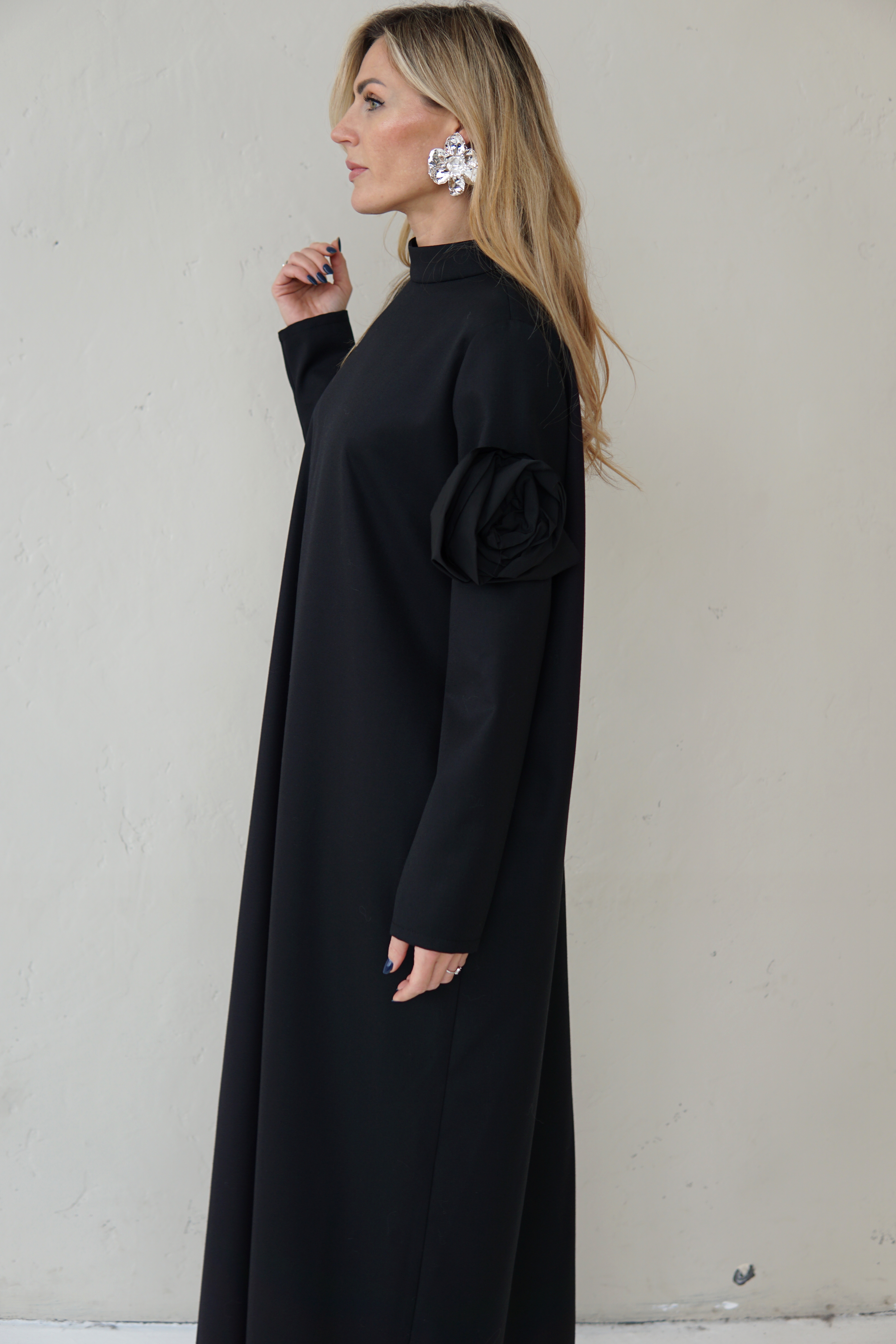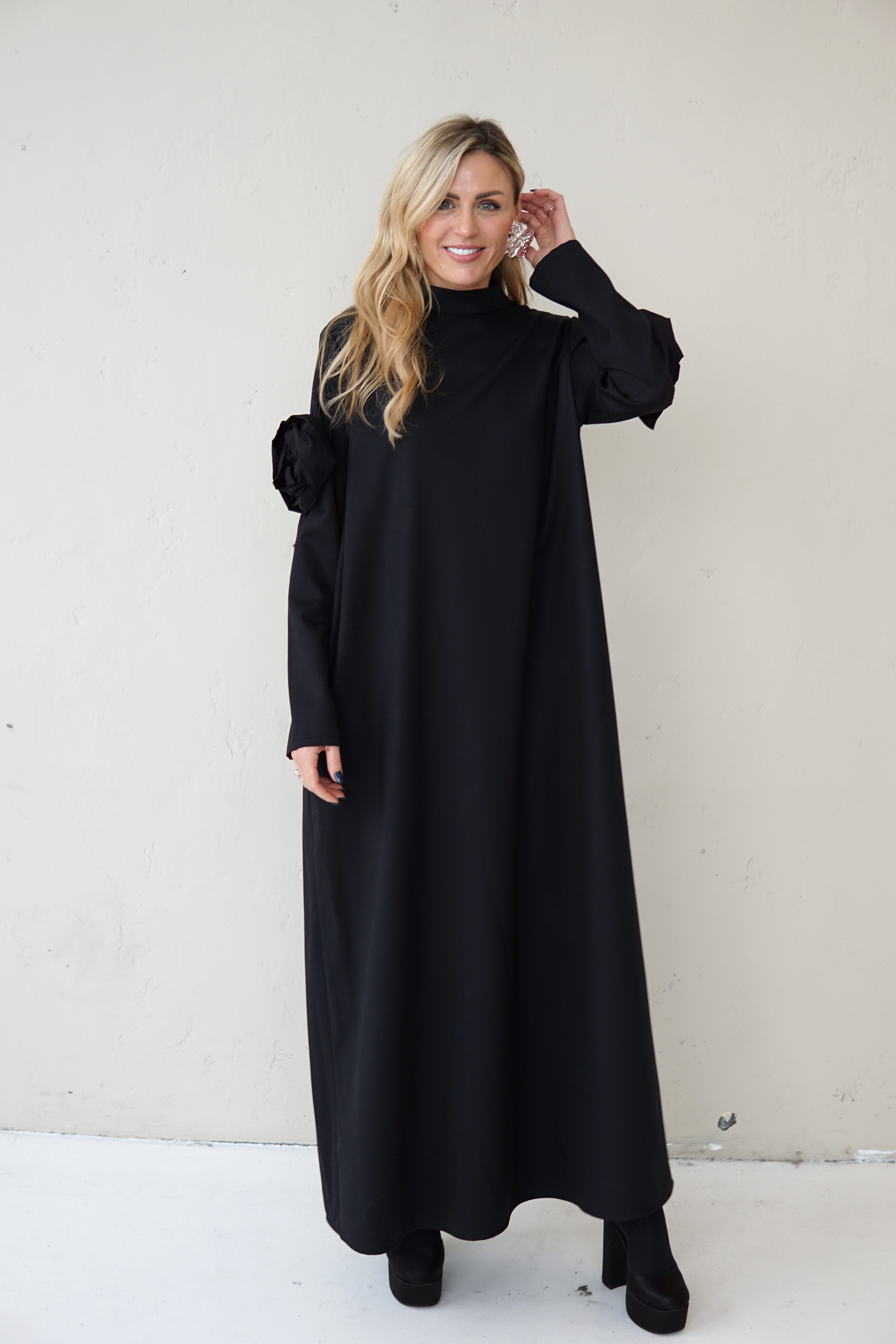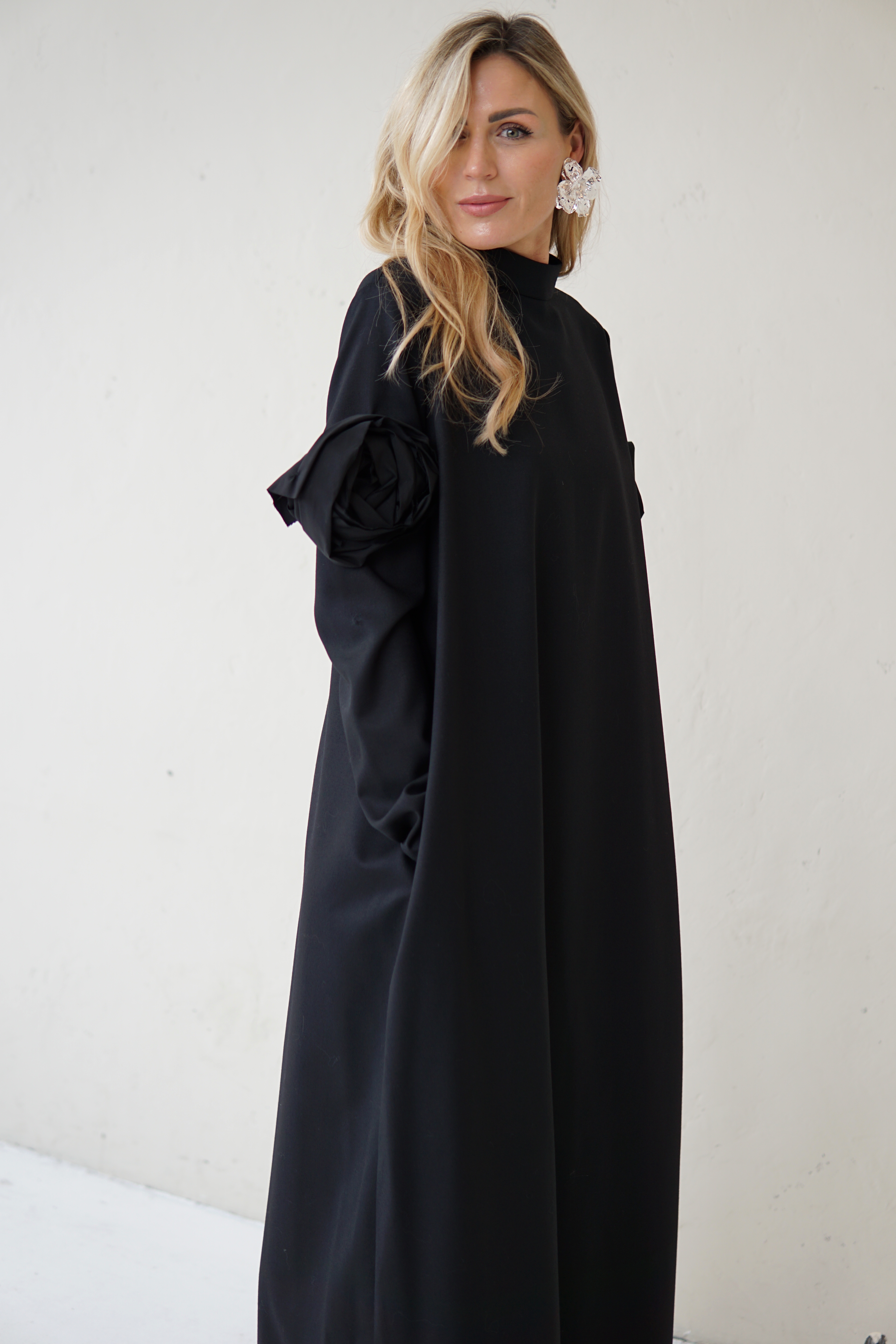 This is a modern edgy office dress that will suit any figure, send us your measurements and we will make a dress that will perfectly fit your figure. This classic womenswear dress is made of luxurious soft wool that falls freely to the ground and flatters your body. This black cocktail dress is long to the ground in a loose silhouette with pockets in the side seam. The evening gown dress is decorated with taffeta flowers on the sleeves, which gives it a luxurious look. The long black couture dress has a high stand-up collar that looks very modern. The dress fastens with a zipper in the back. This dress will be perfect for work or a party. It will express your personality and emphasize your elegance.