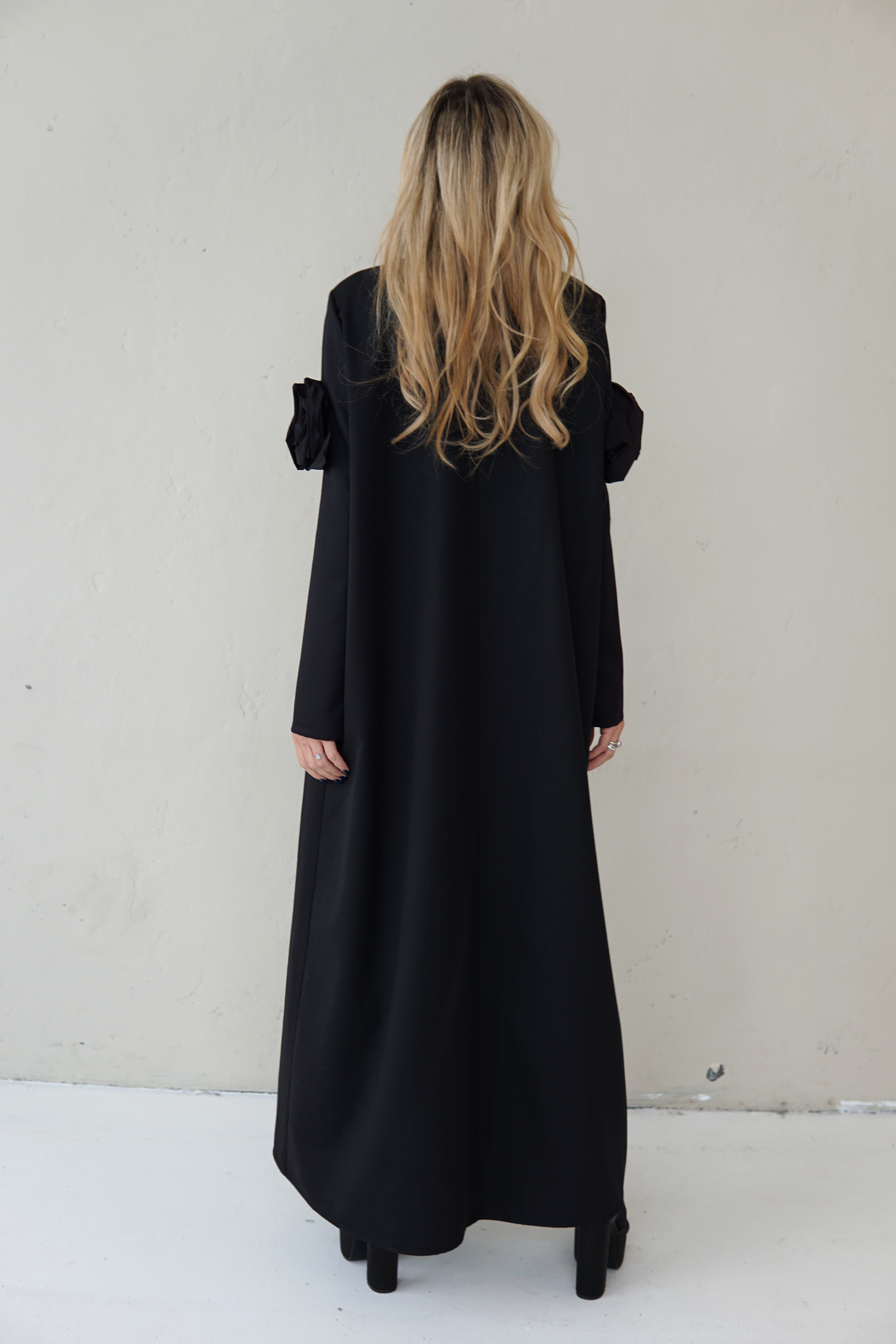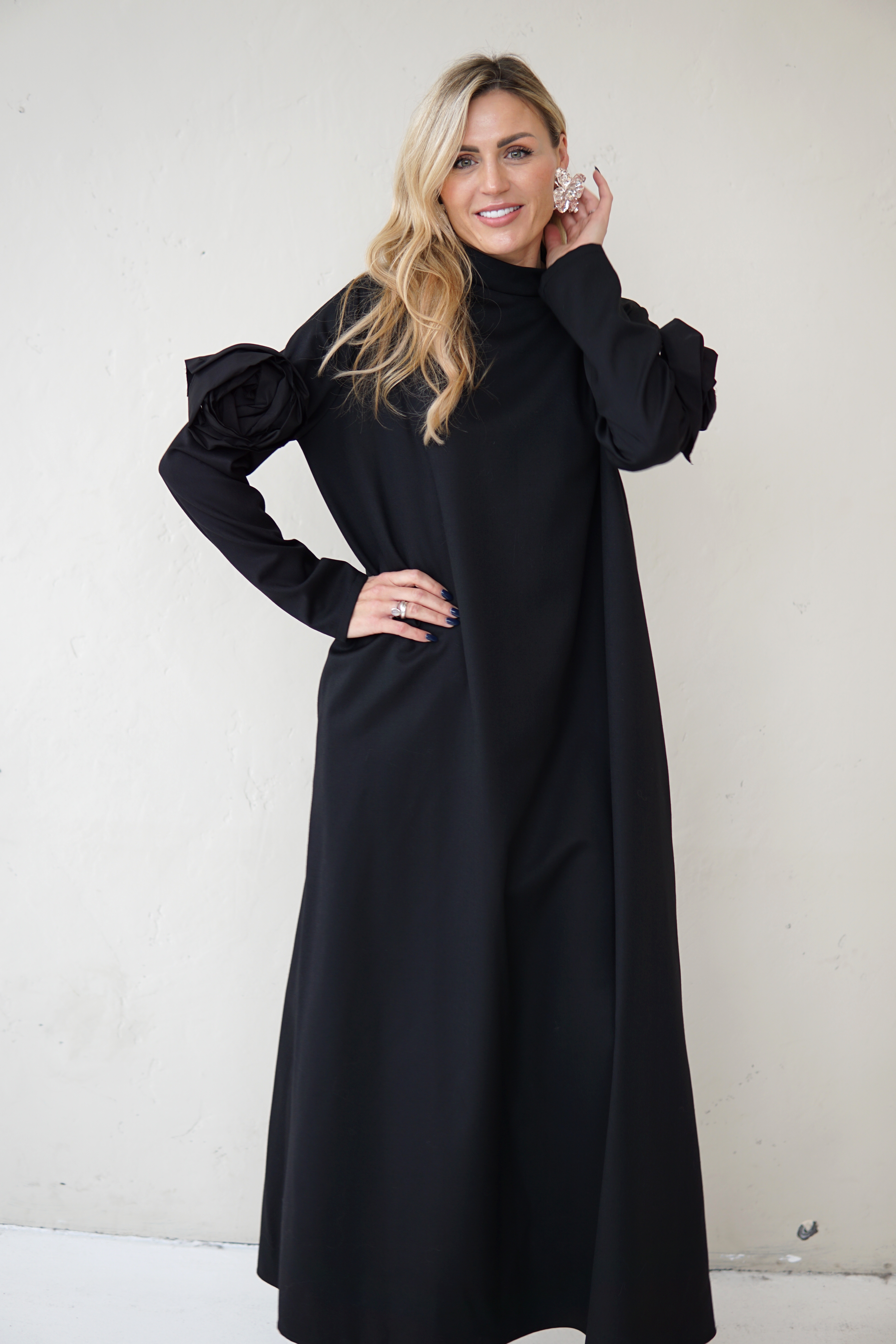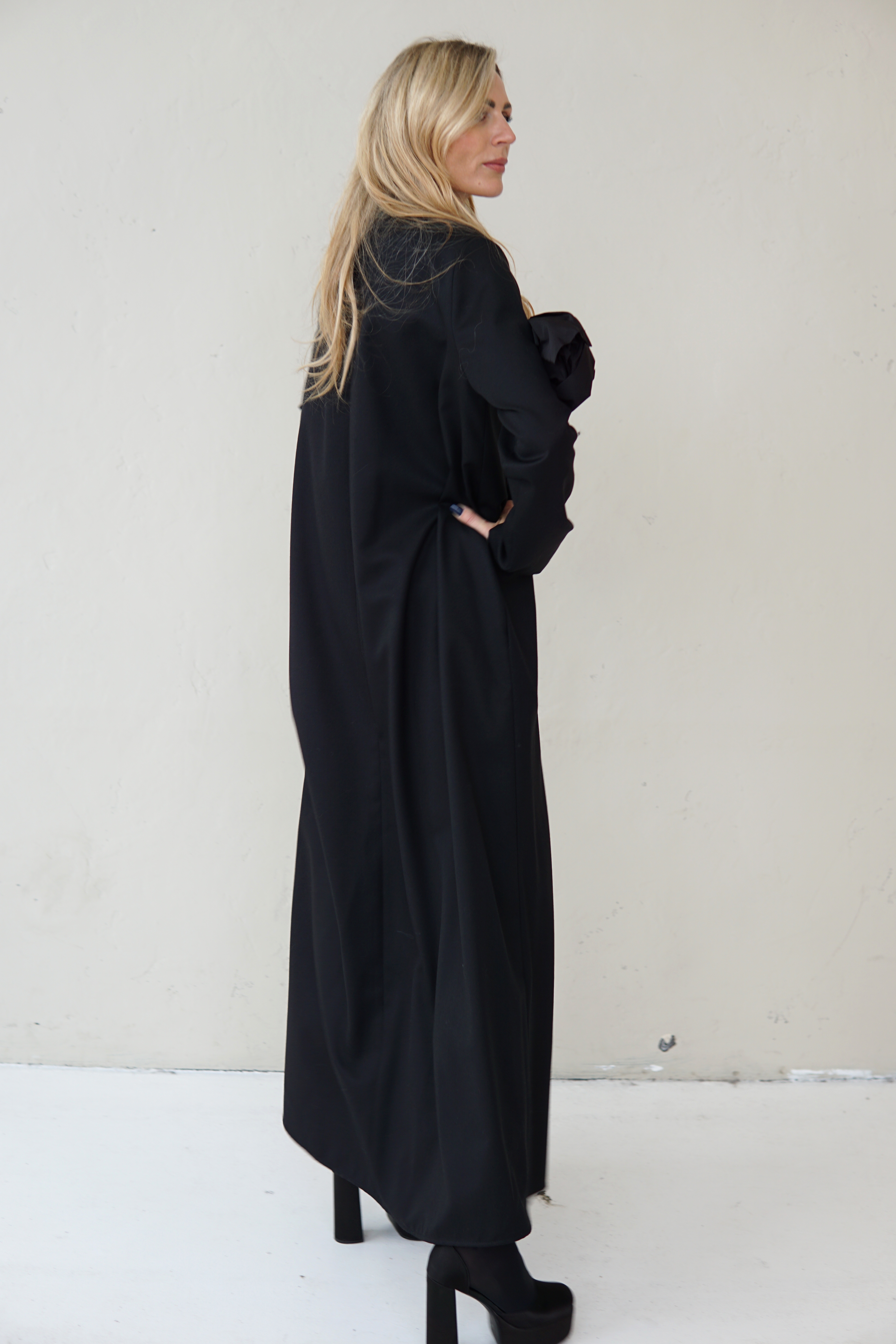 Edgy Wool Couture Gown, Black Maxi Dress with Taffeta Roses