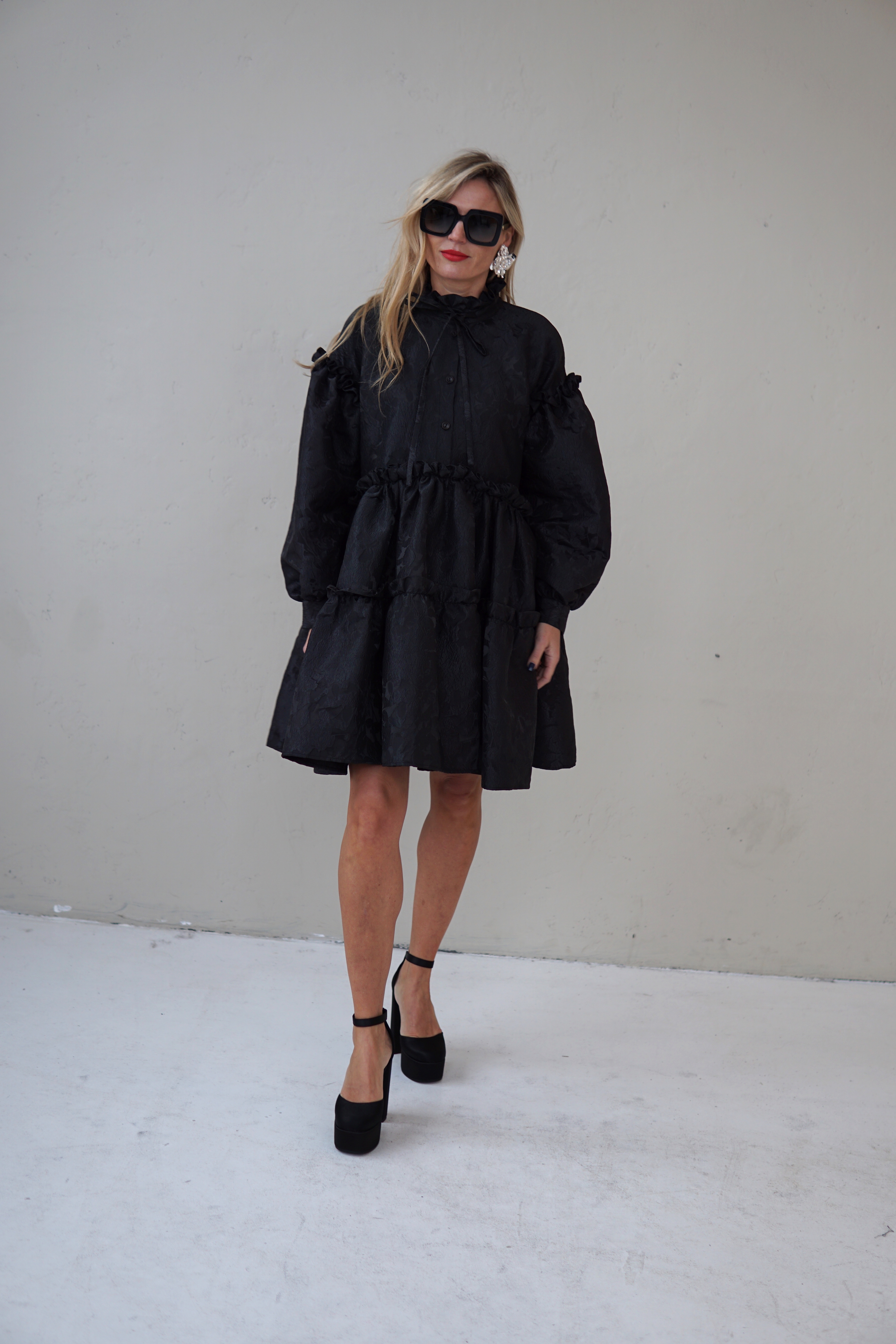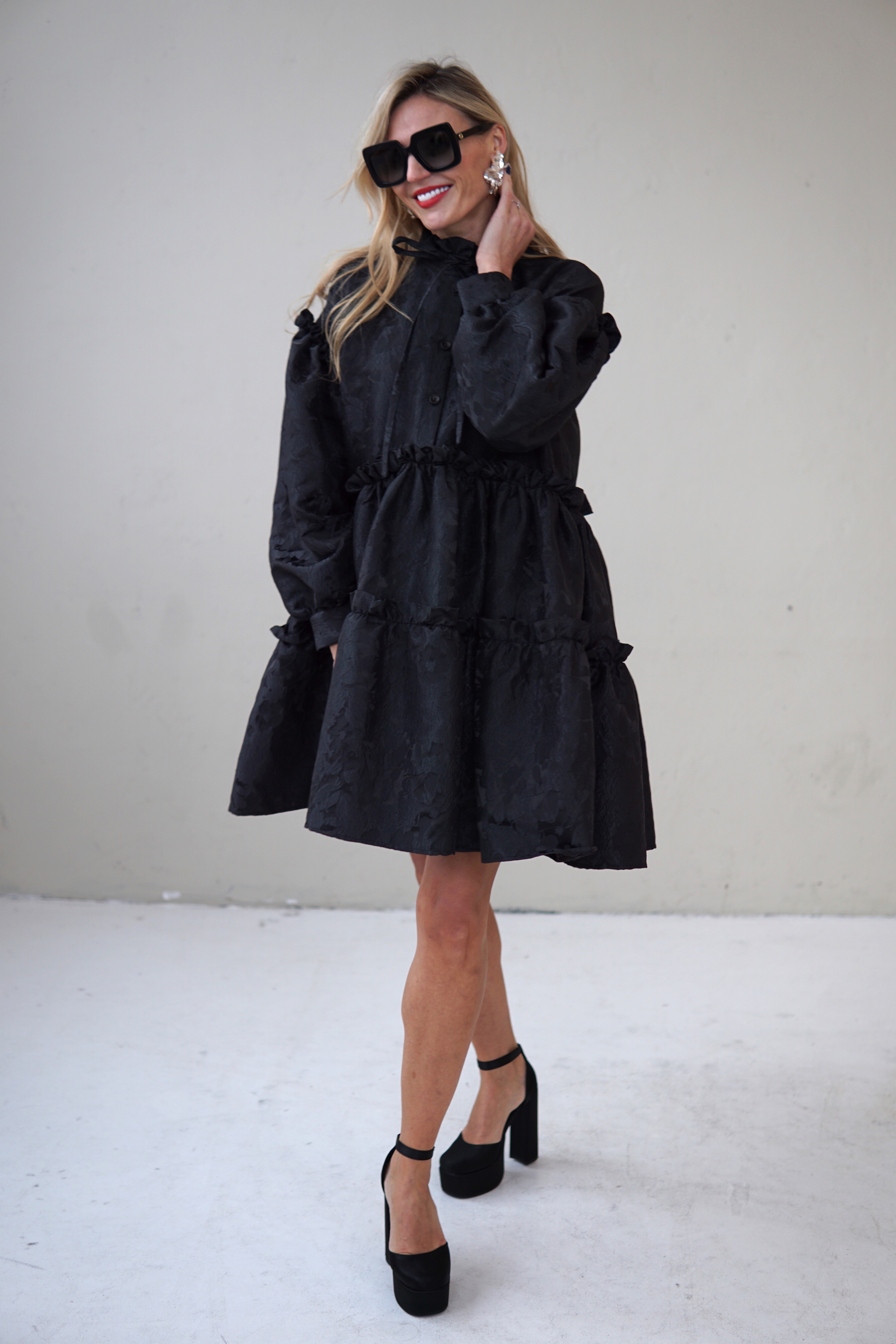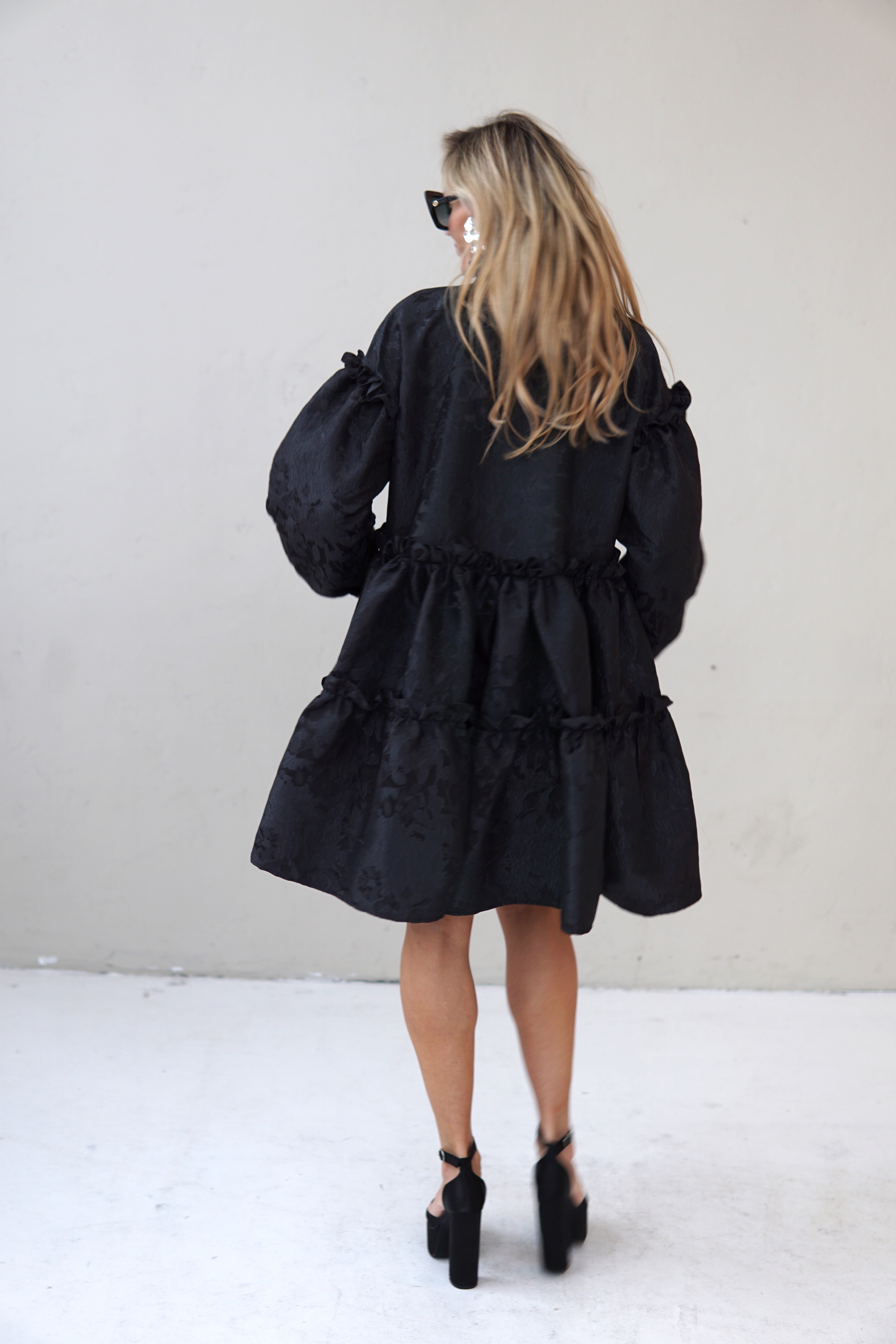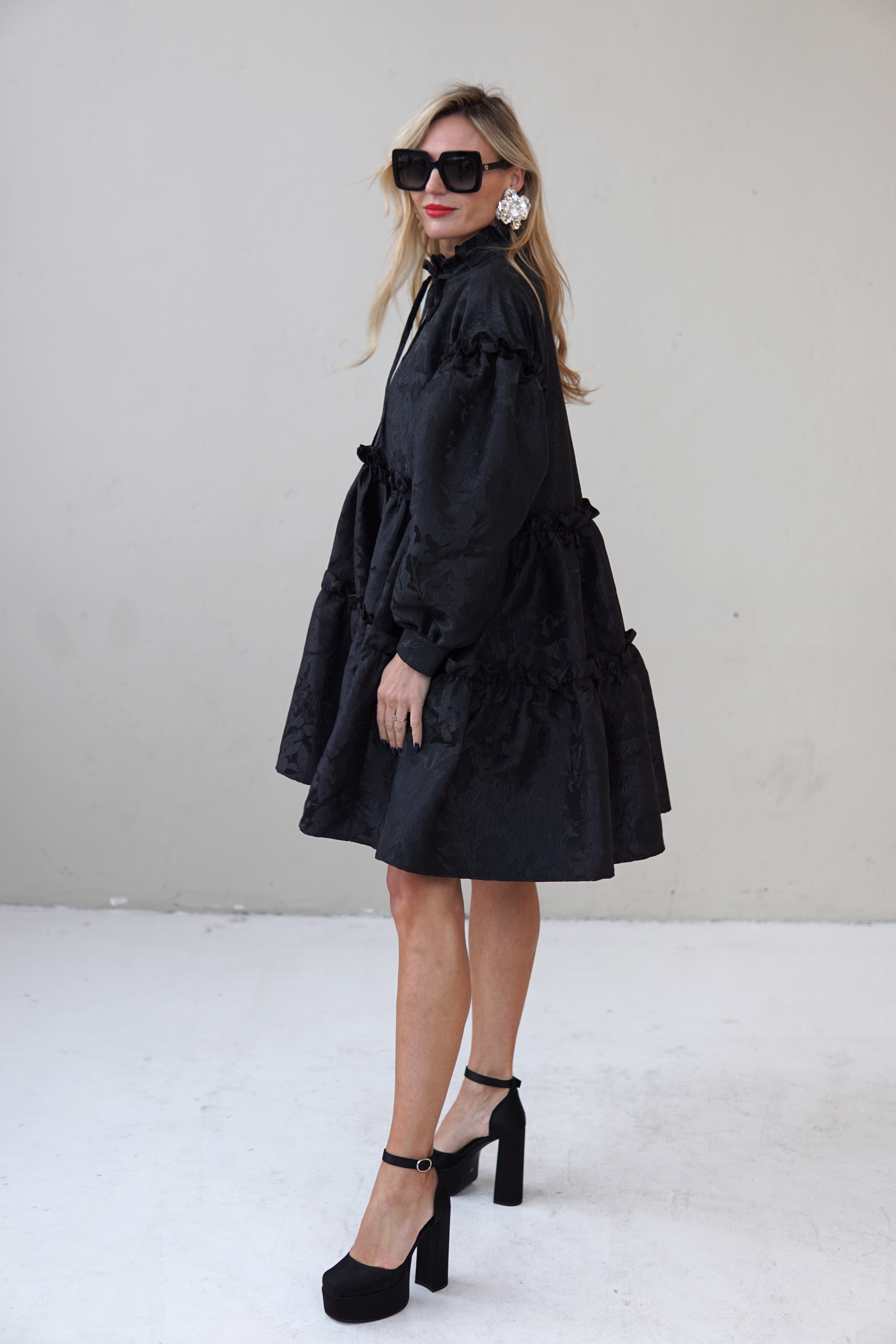 This black jacquard dress is a distinctive designer creation where form, construction and creativity meet.
