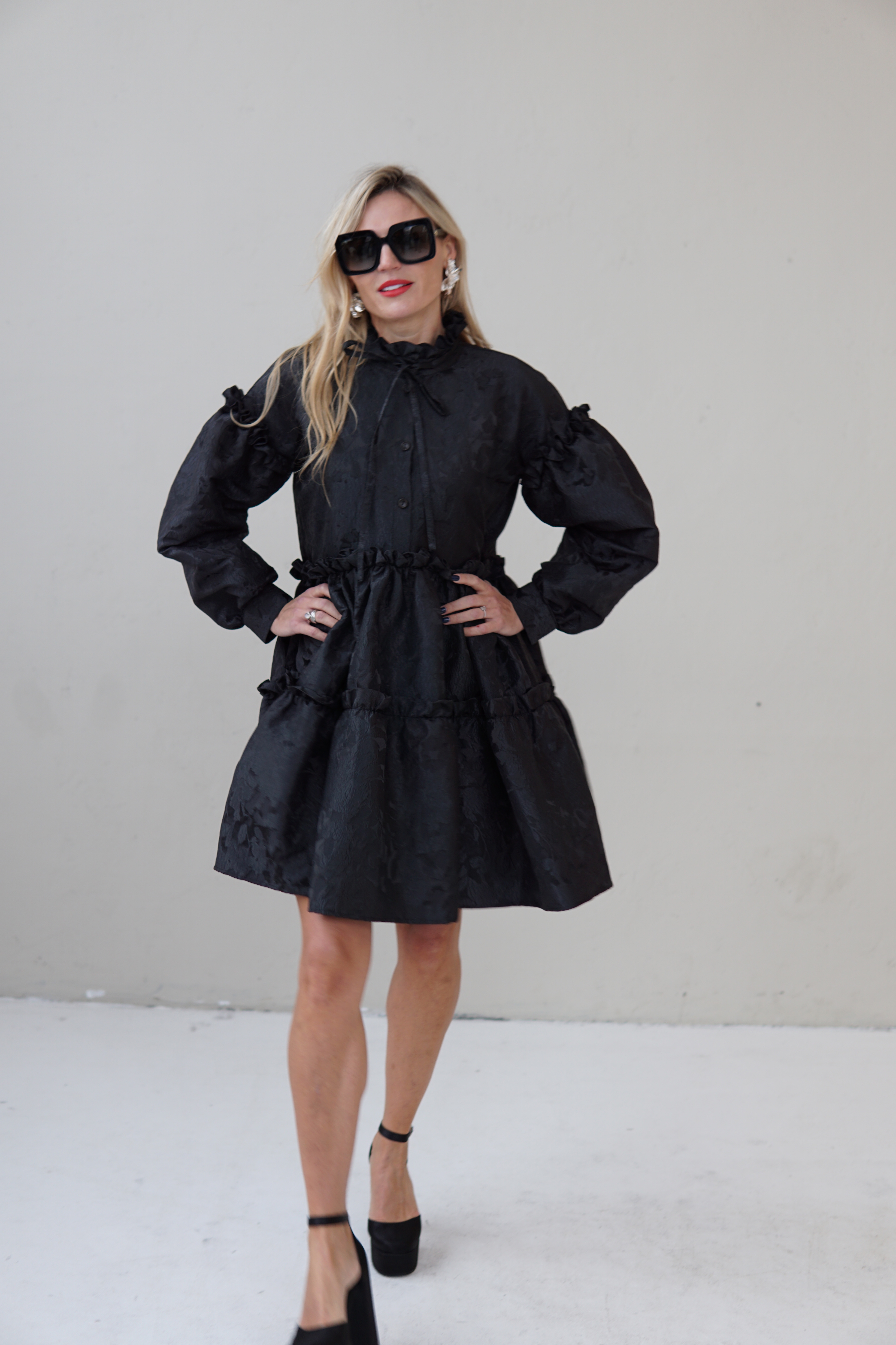 Black Jacquard Designer Dress – Luxury Puff Sleeve Knee Length Dress, Contemporary Slow Fashion Piece, Handmade in Europe