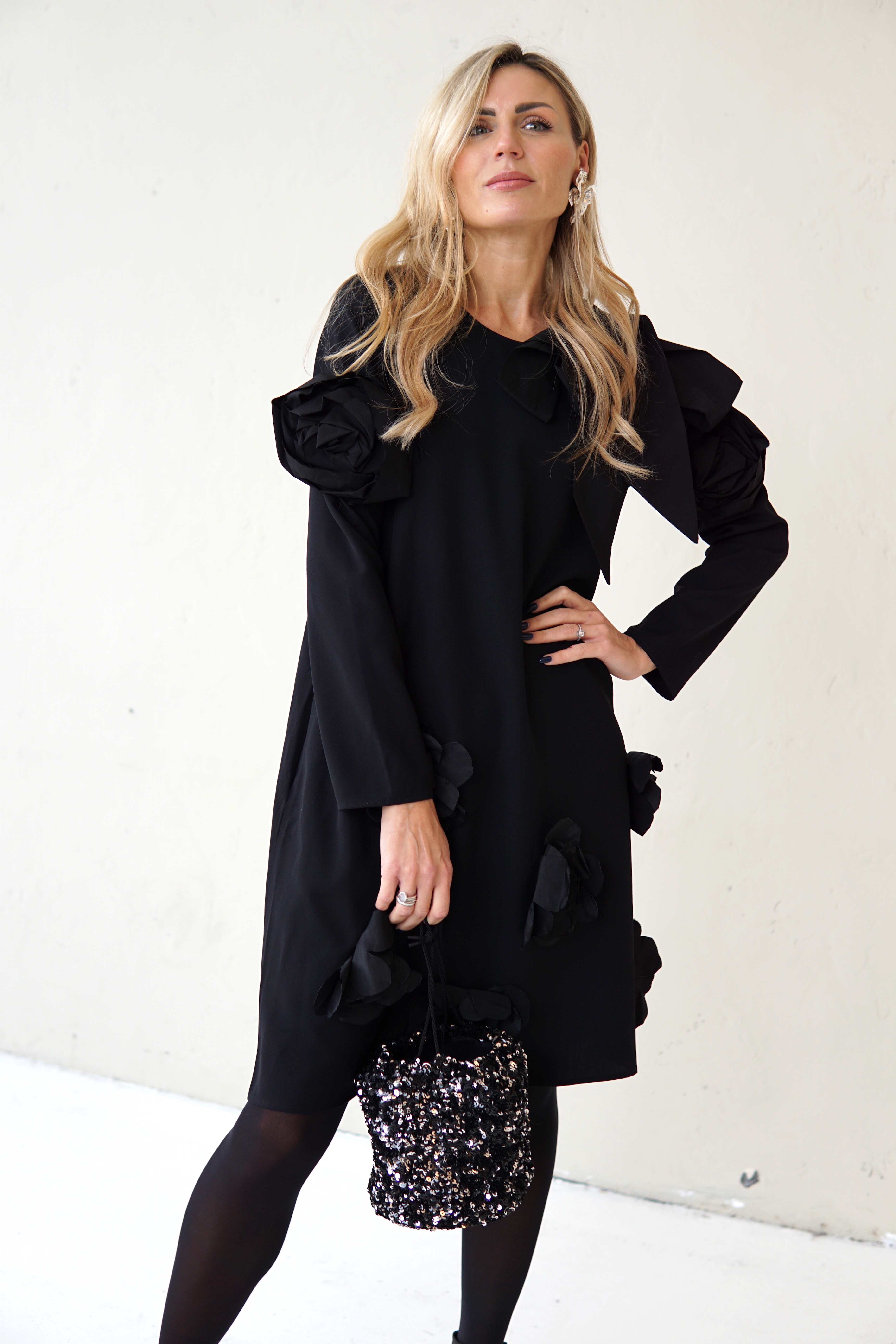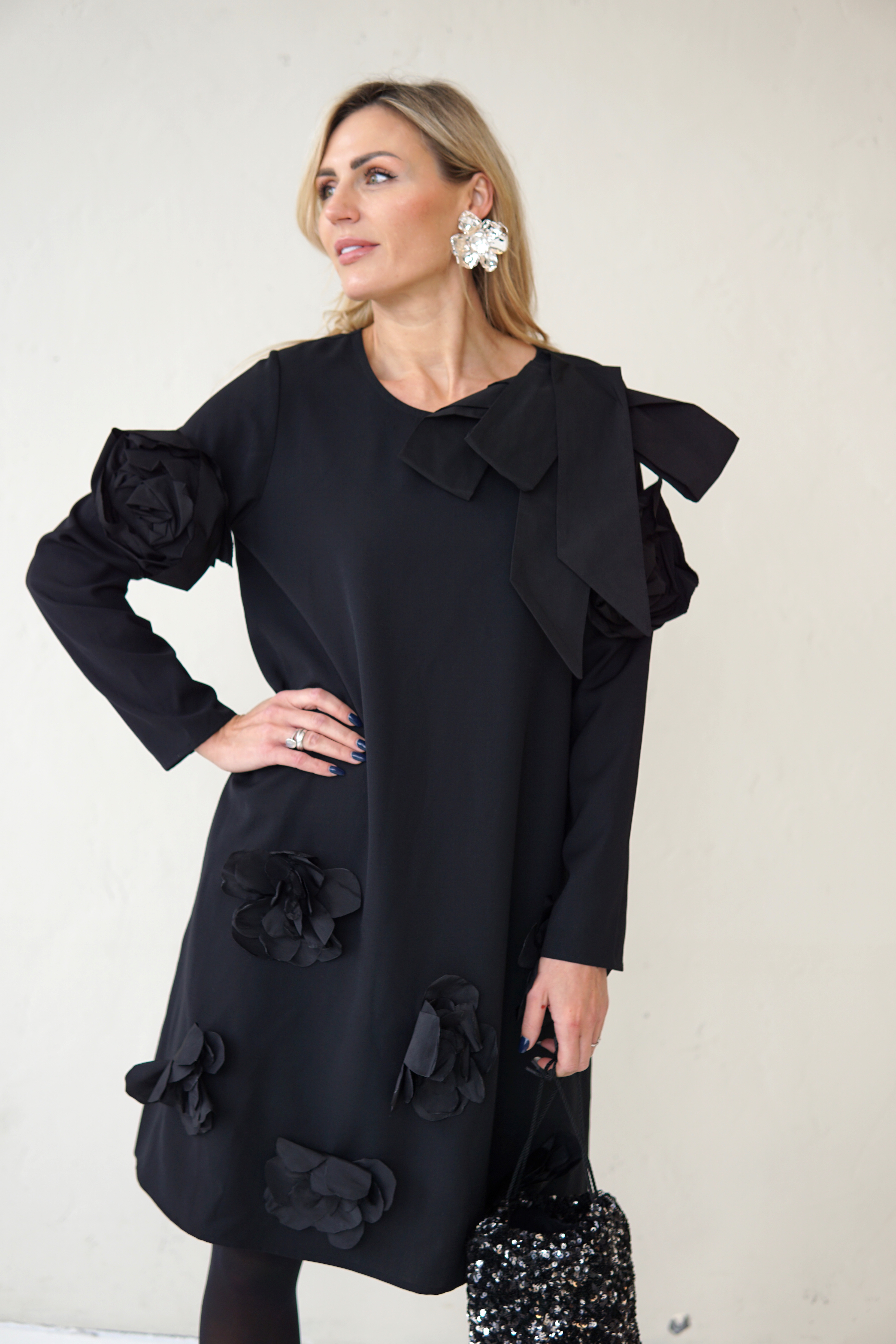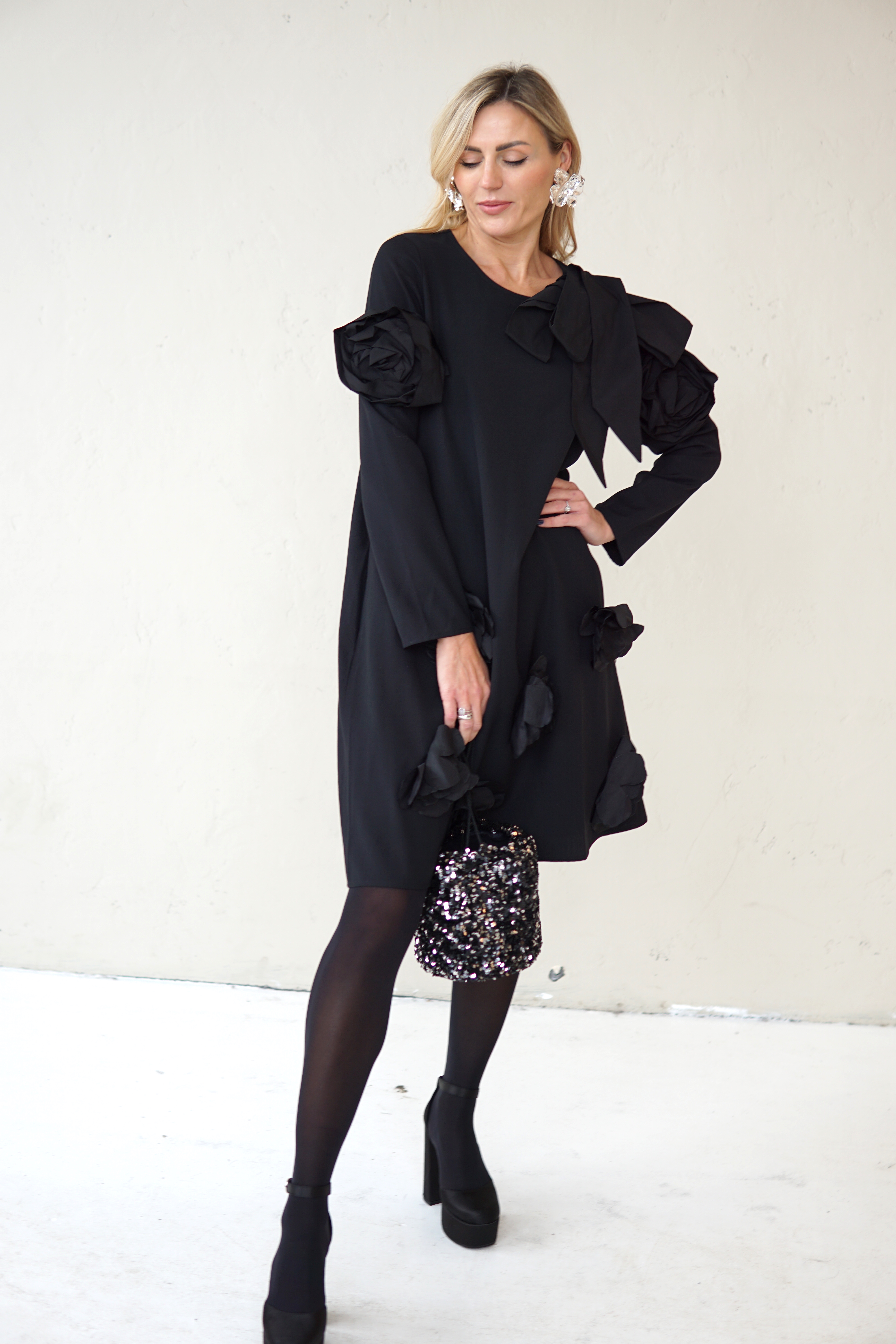 SIMPLE BLACK DRESS DECORATED WITH FLOWERS AND TAFFETA RIBBONS
