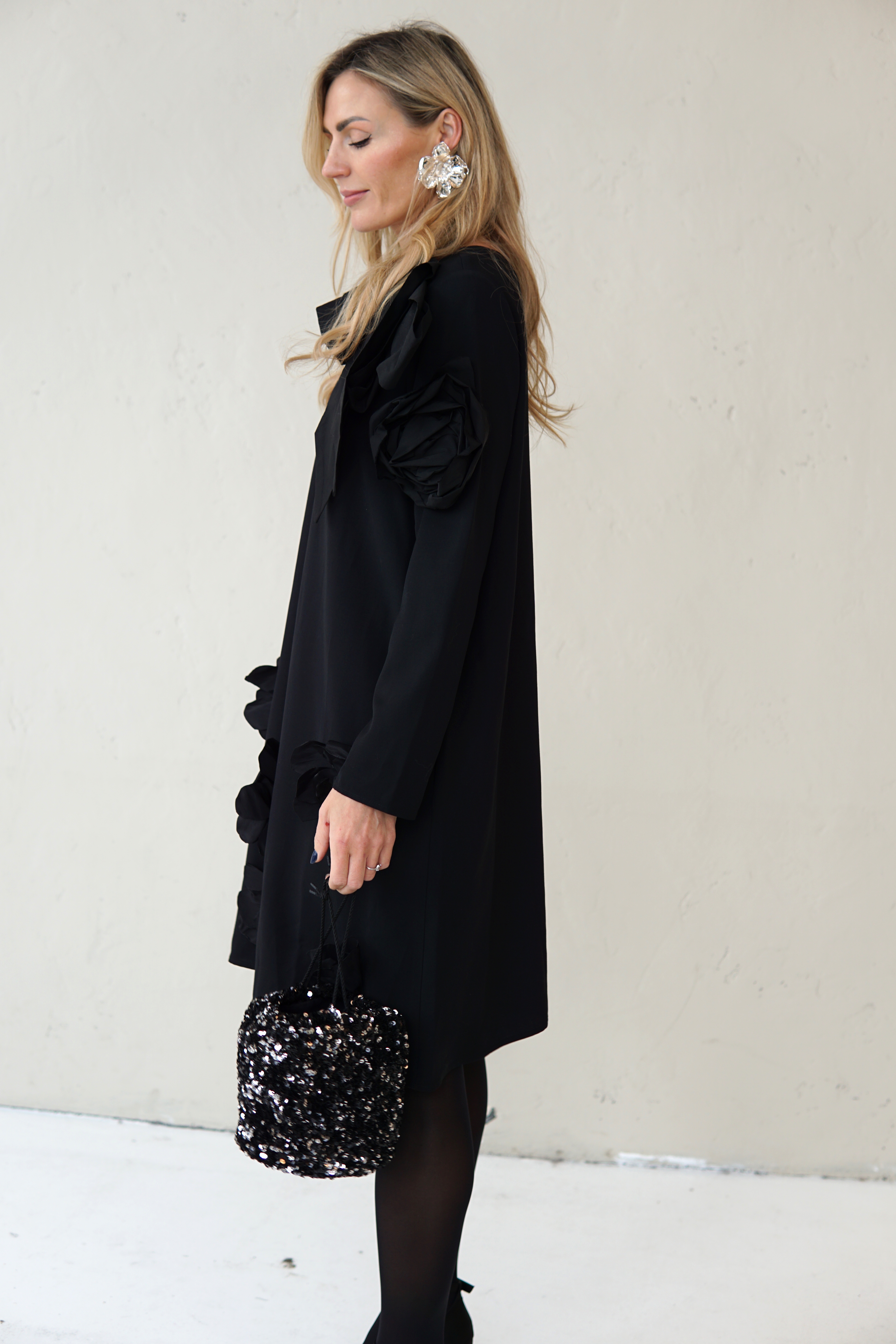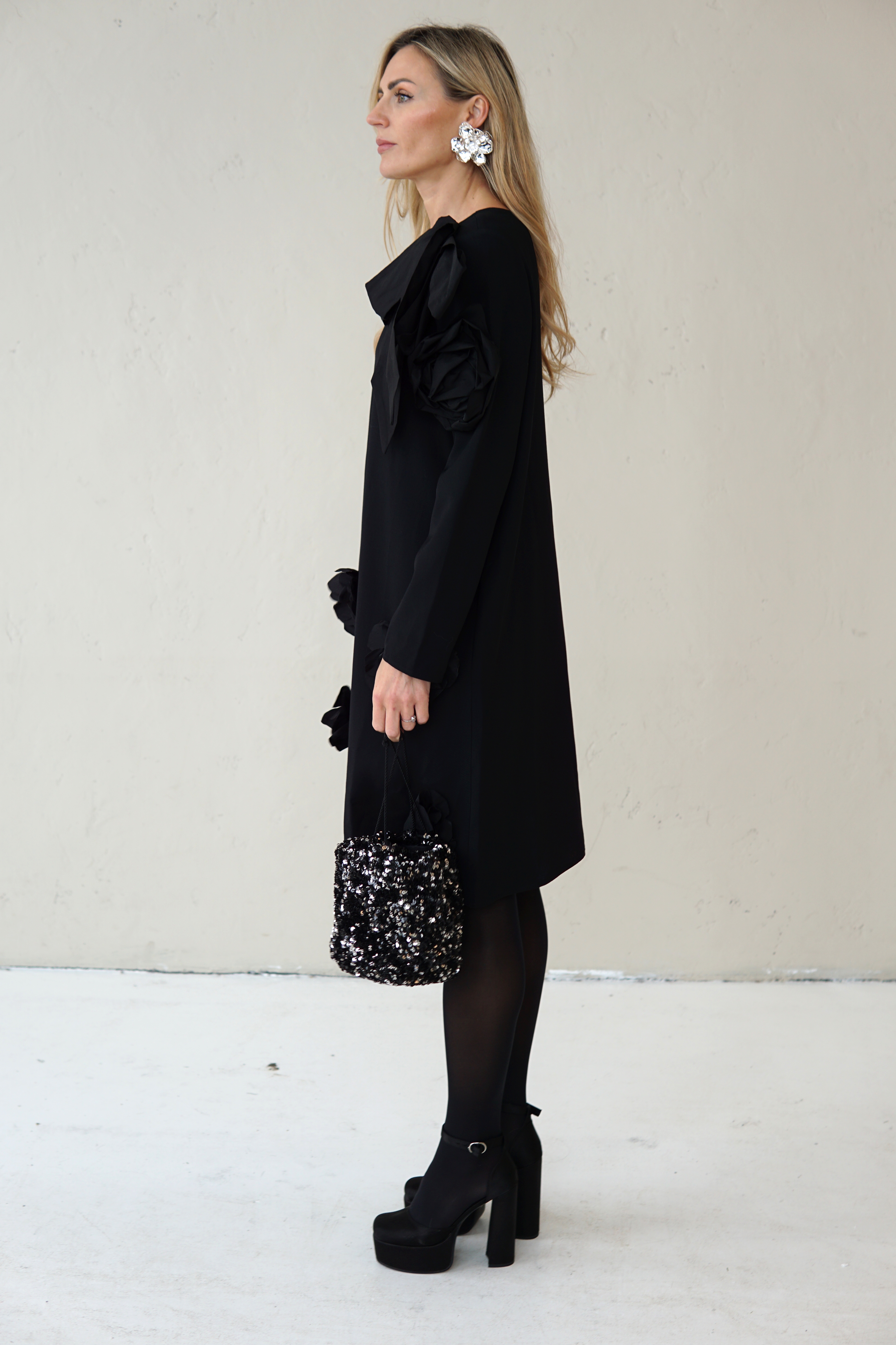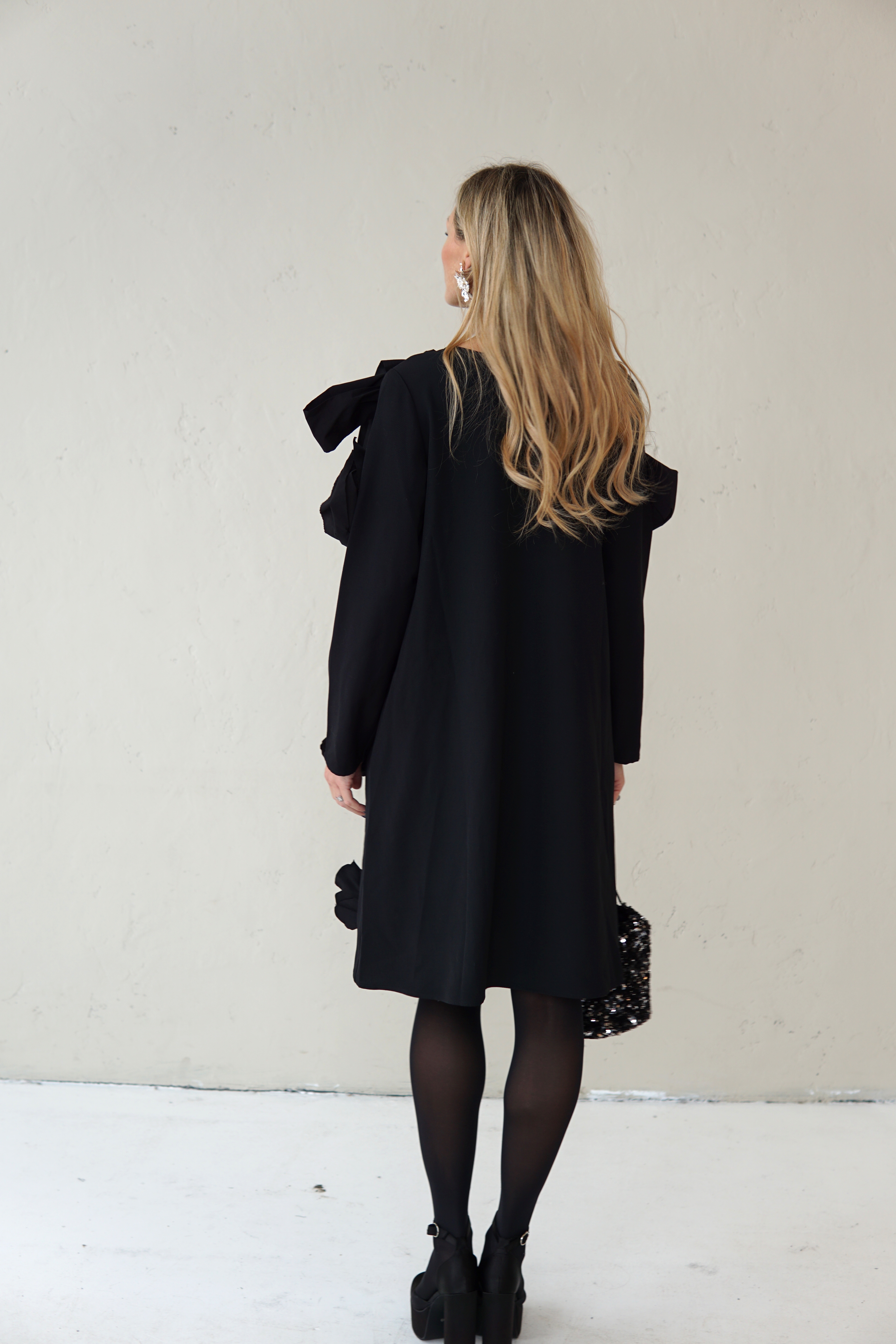 SIMPLE BLACK DRESS DECORATED WITH FLOWERS AND TAFFETA RIBBONS