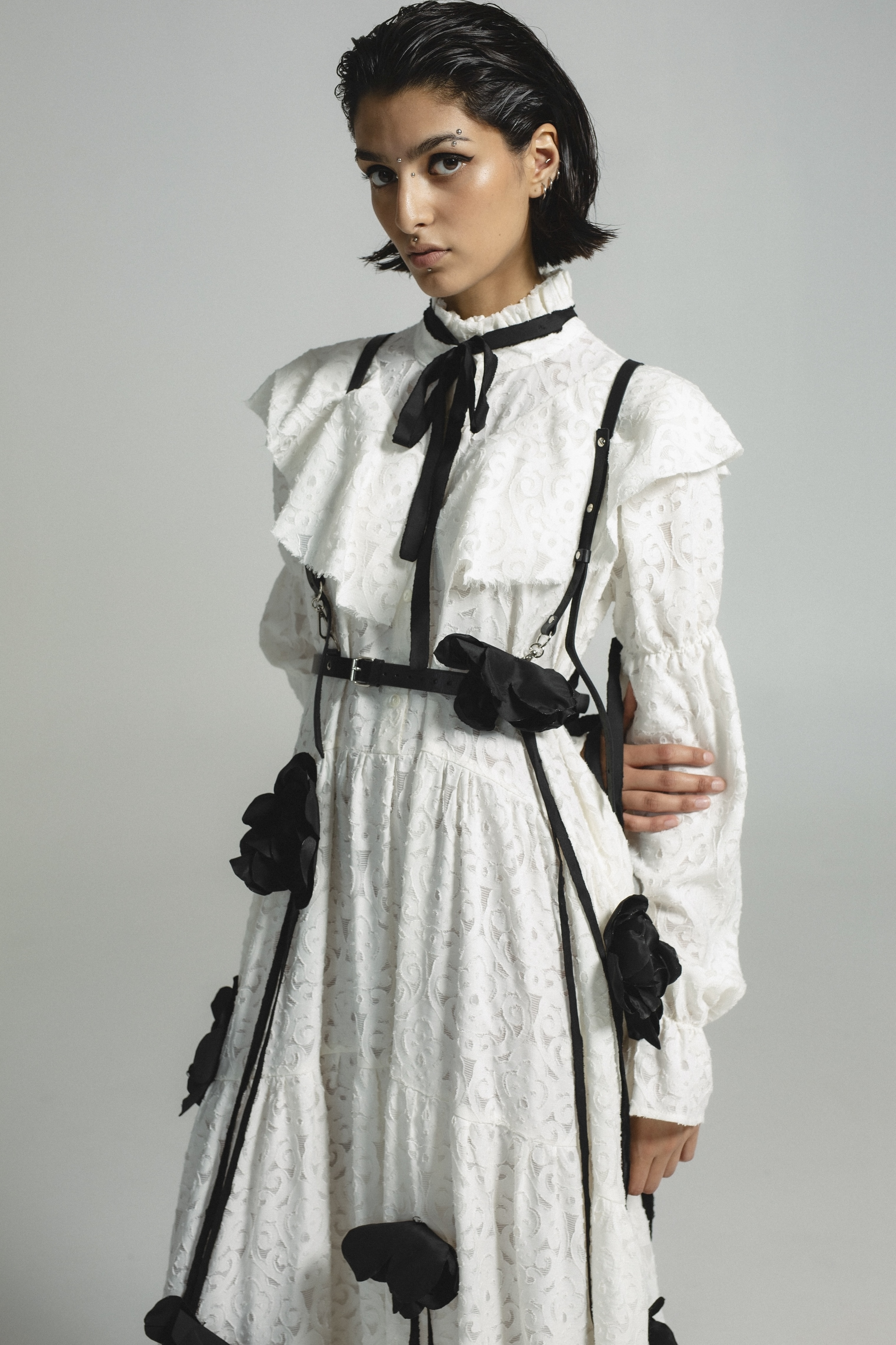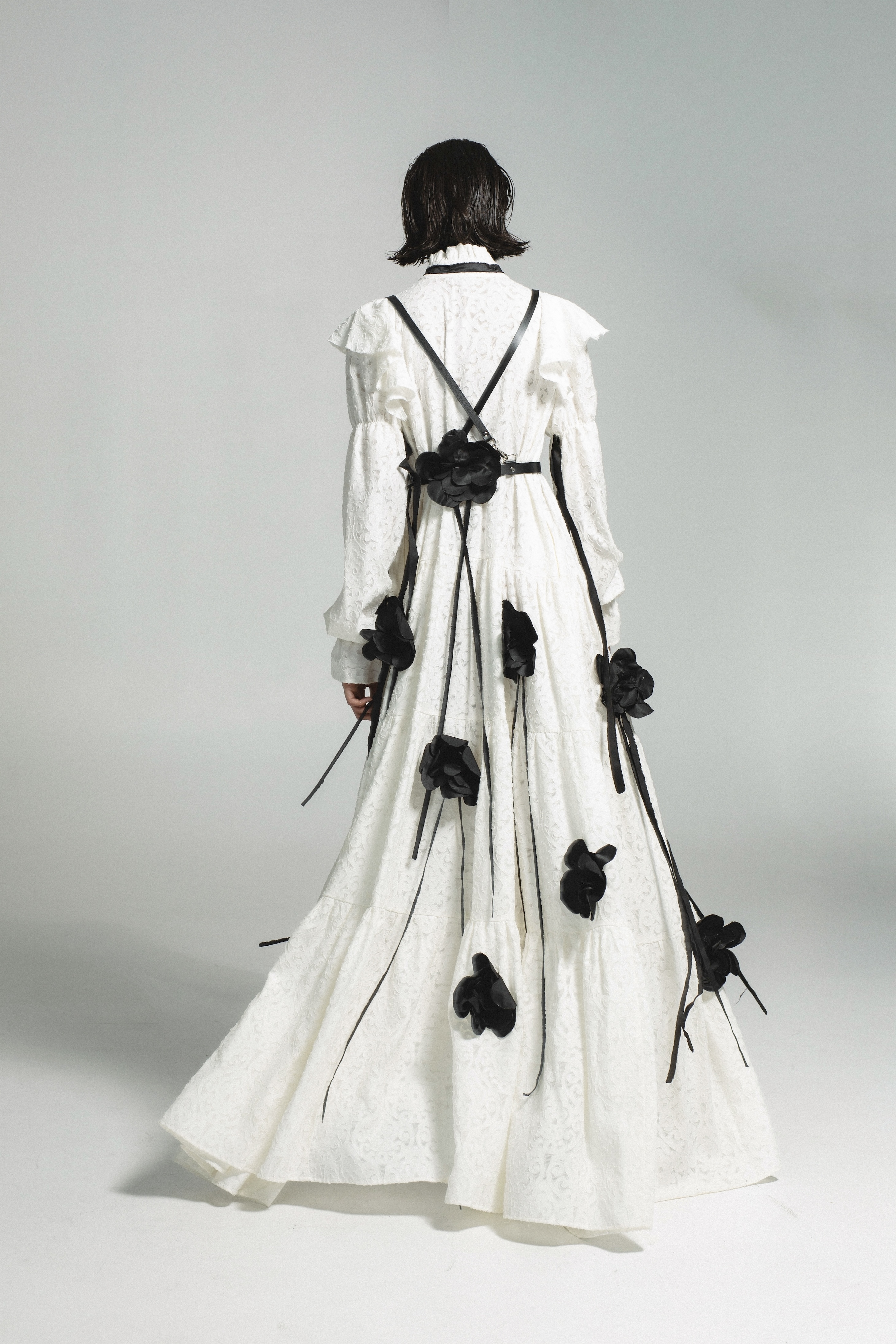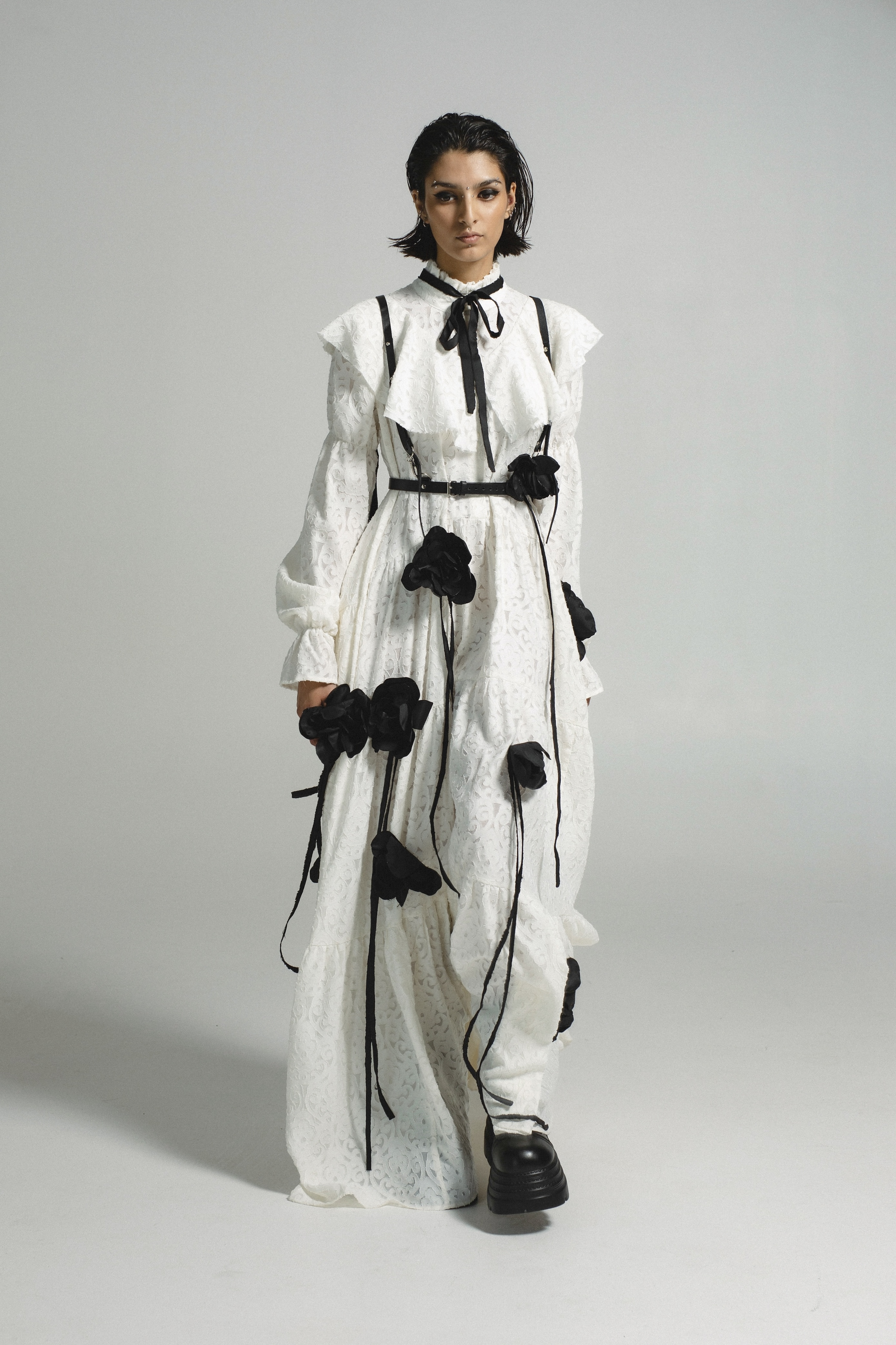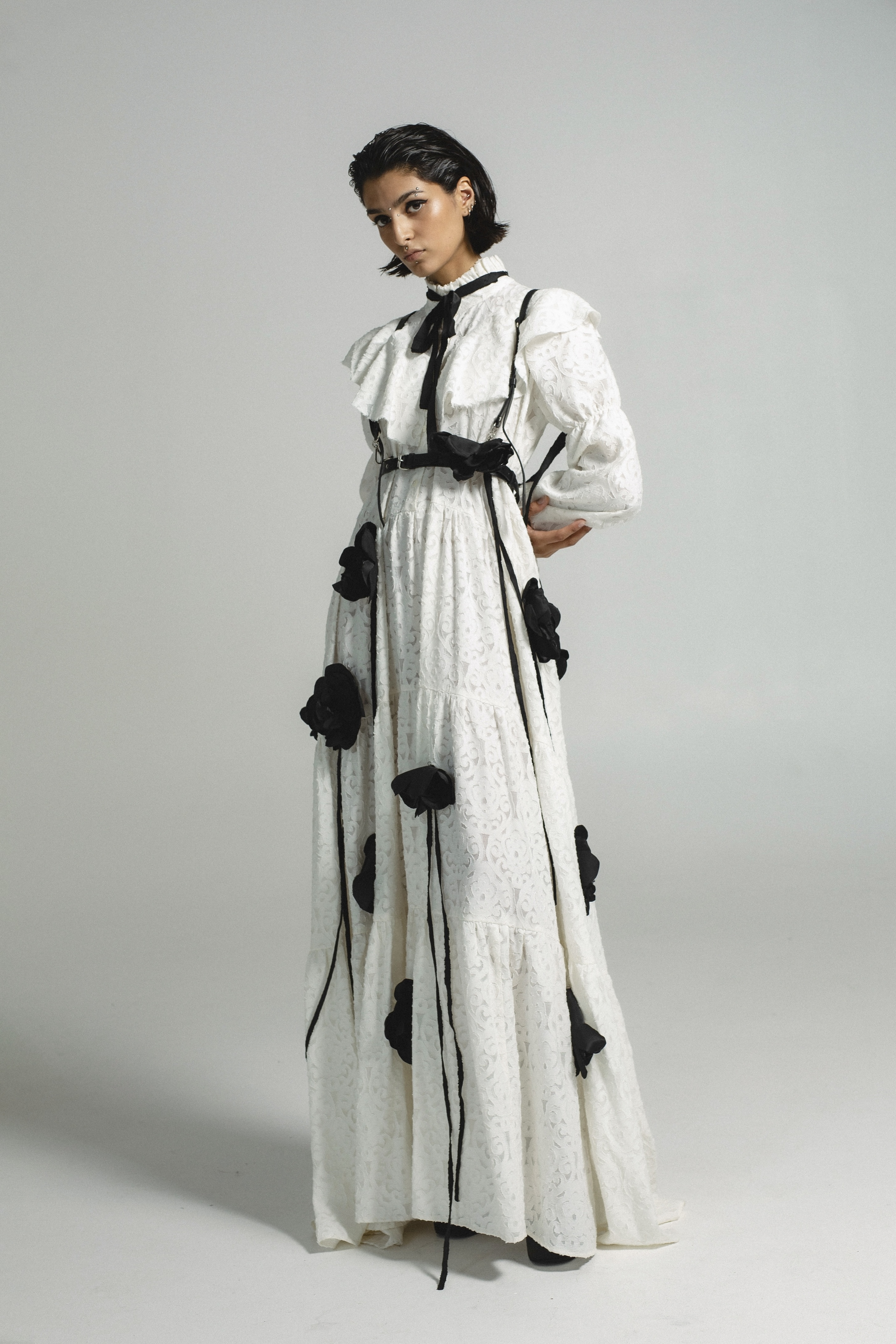 WHITE LONG DRESS WITH FLOWERS AND LONG SLEEVES