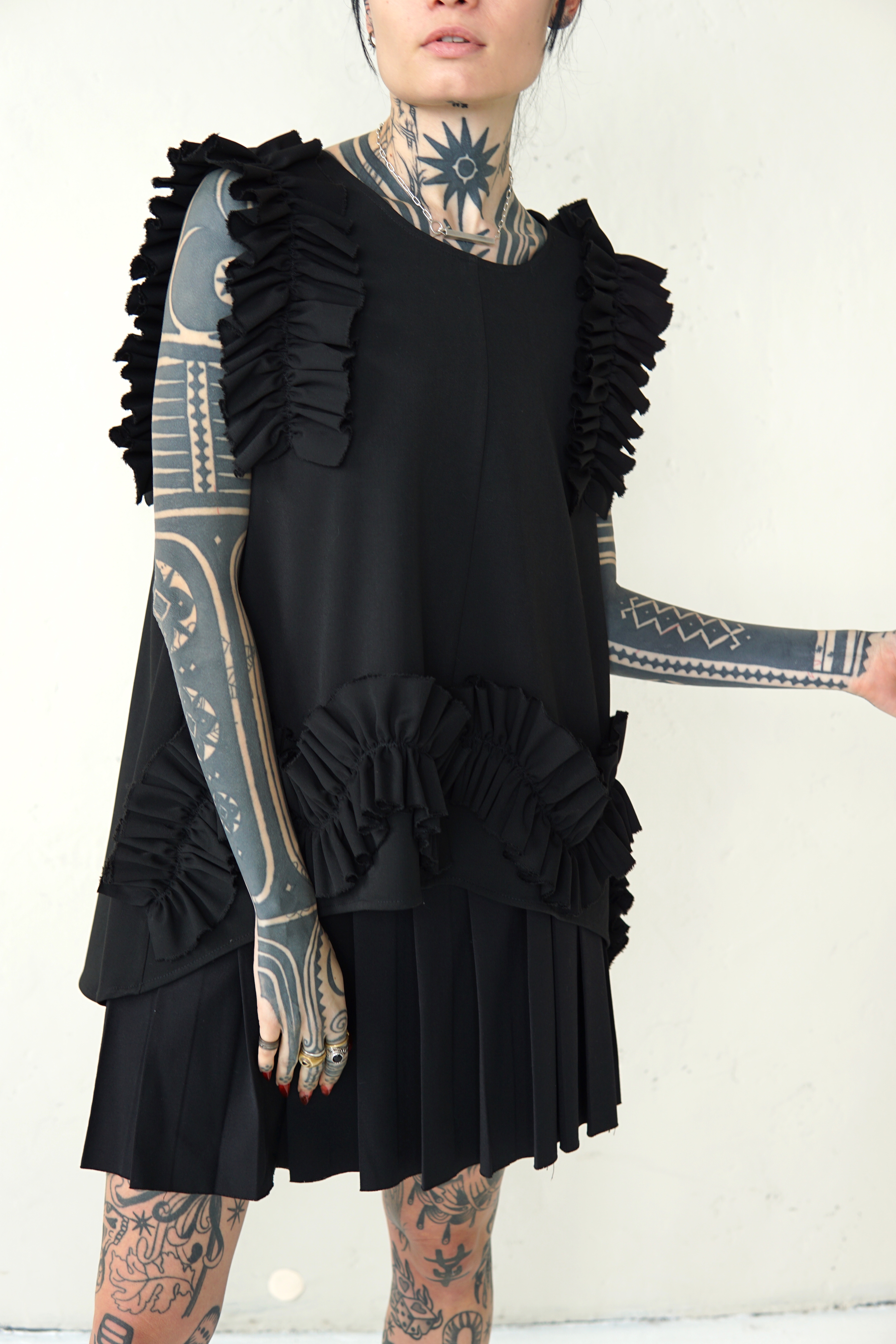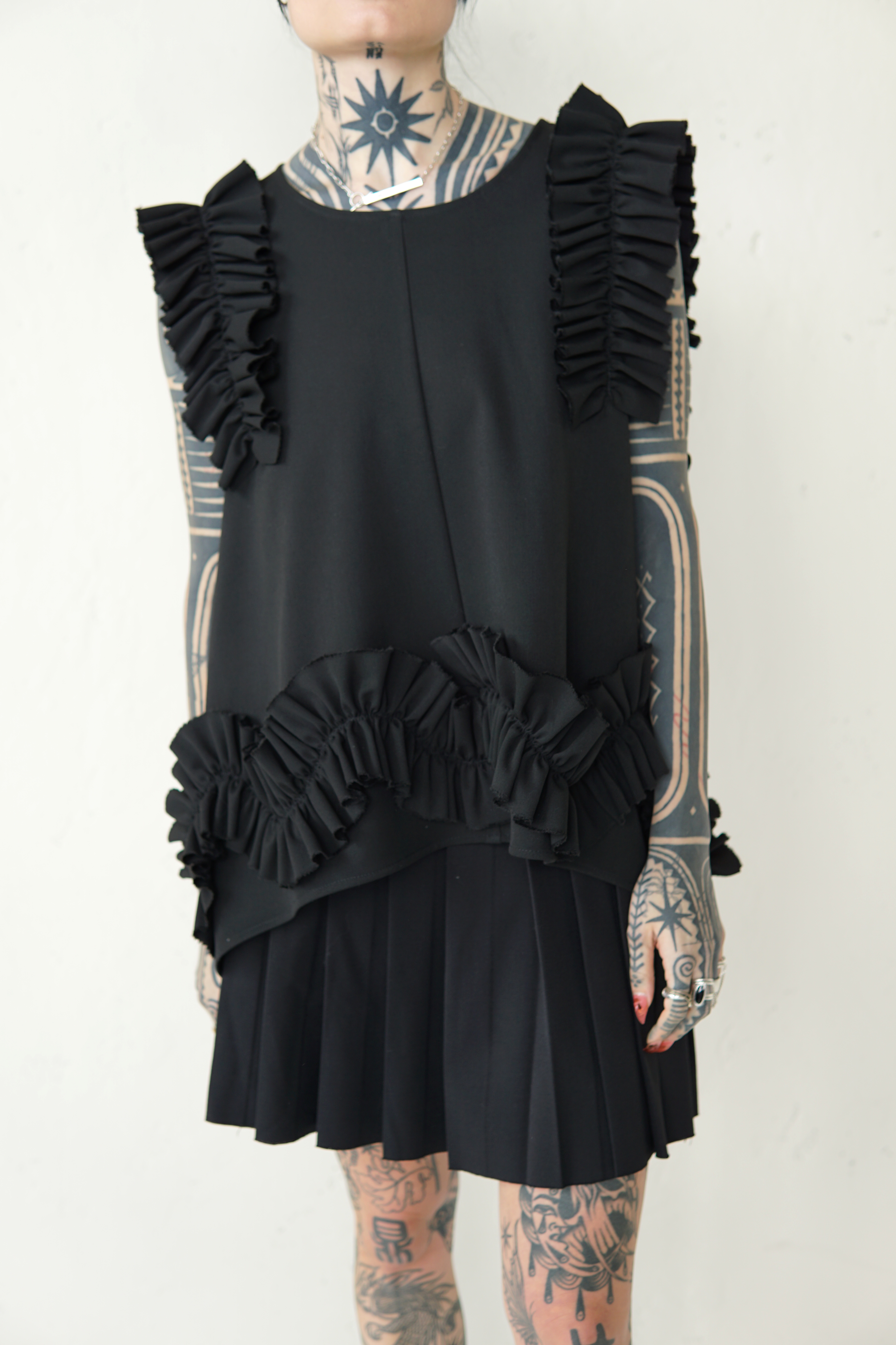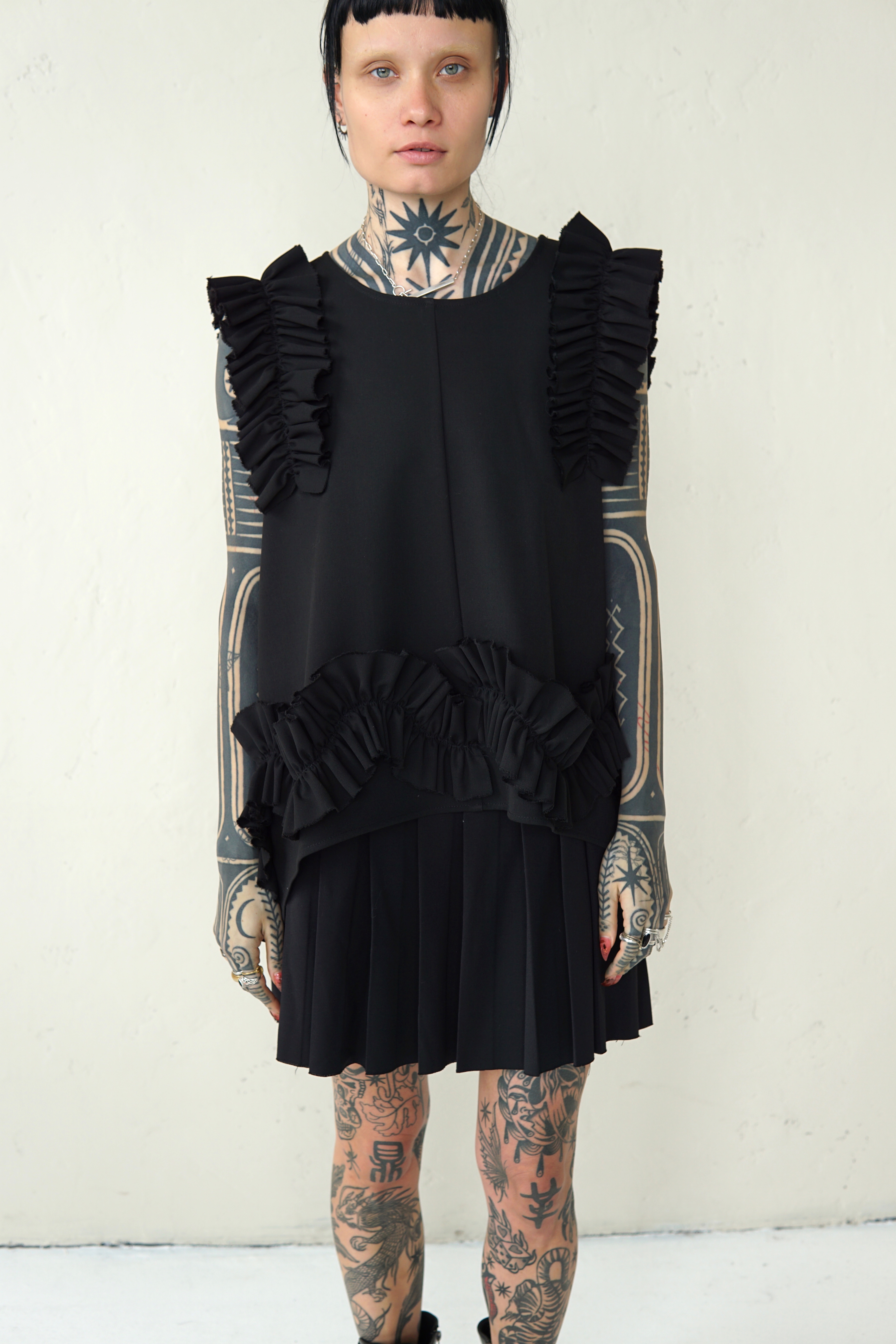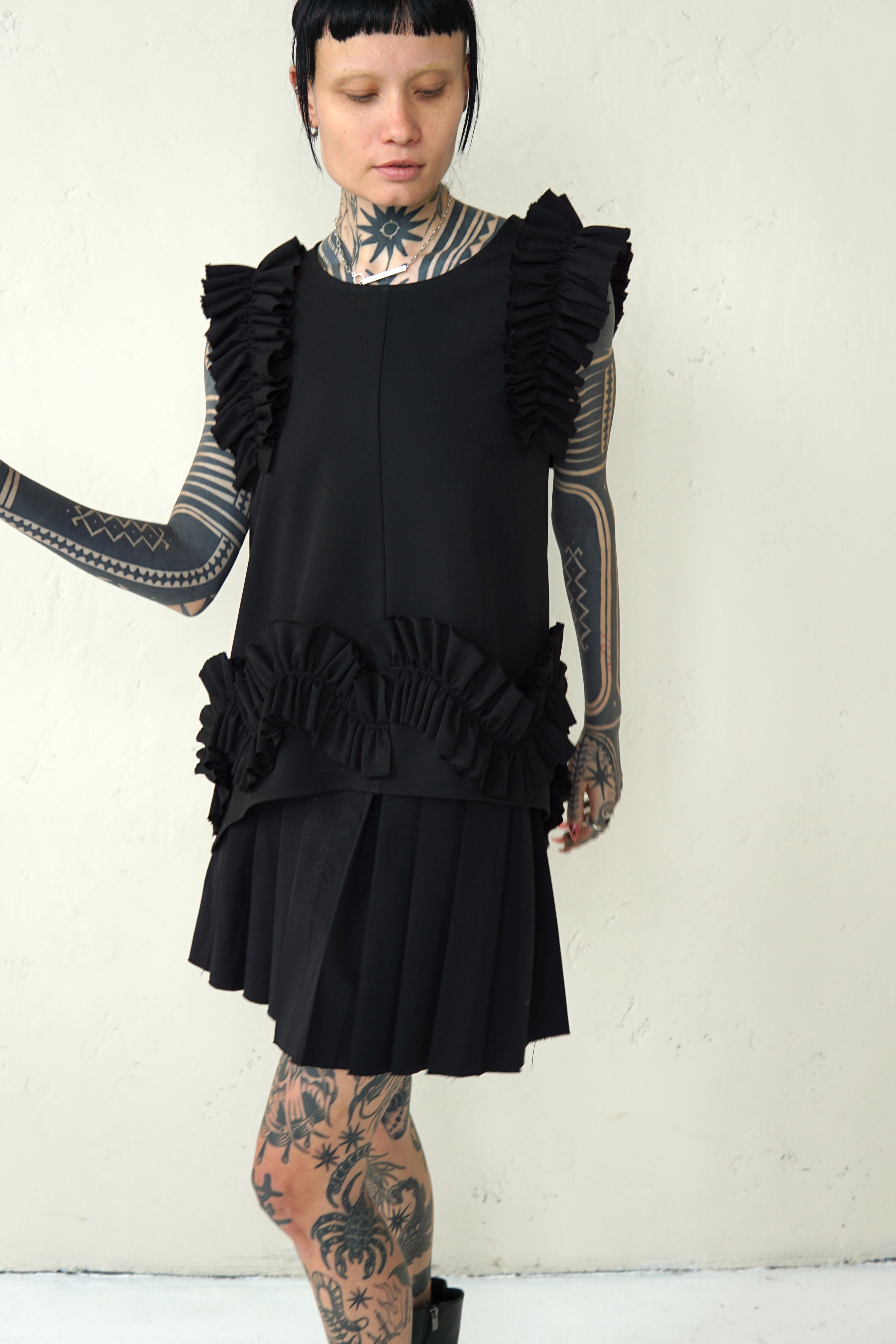 BLACK WOOL BLOUSE WITH RUFFLED DETAILS