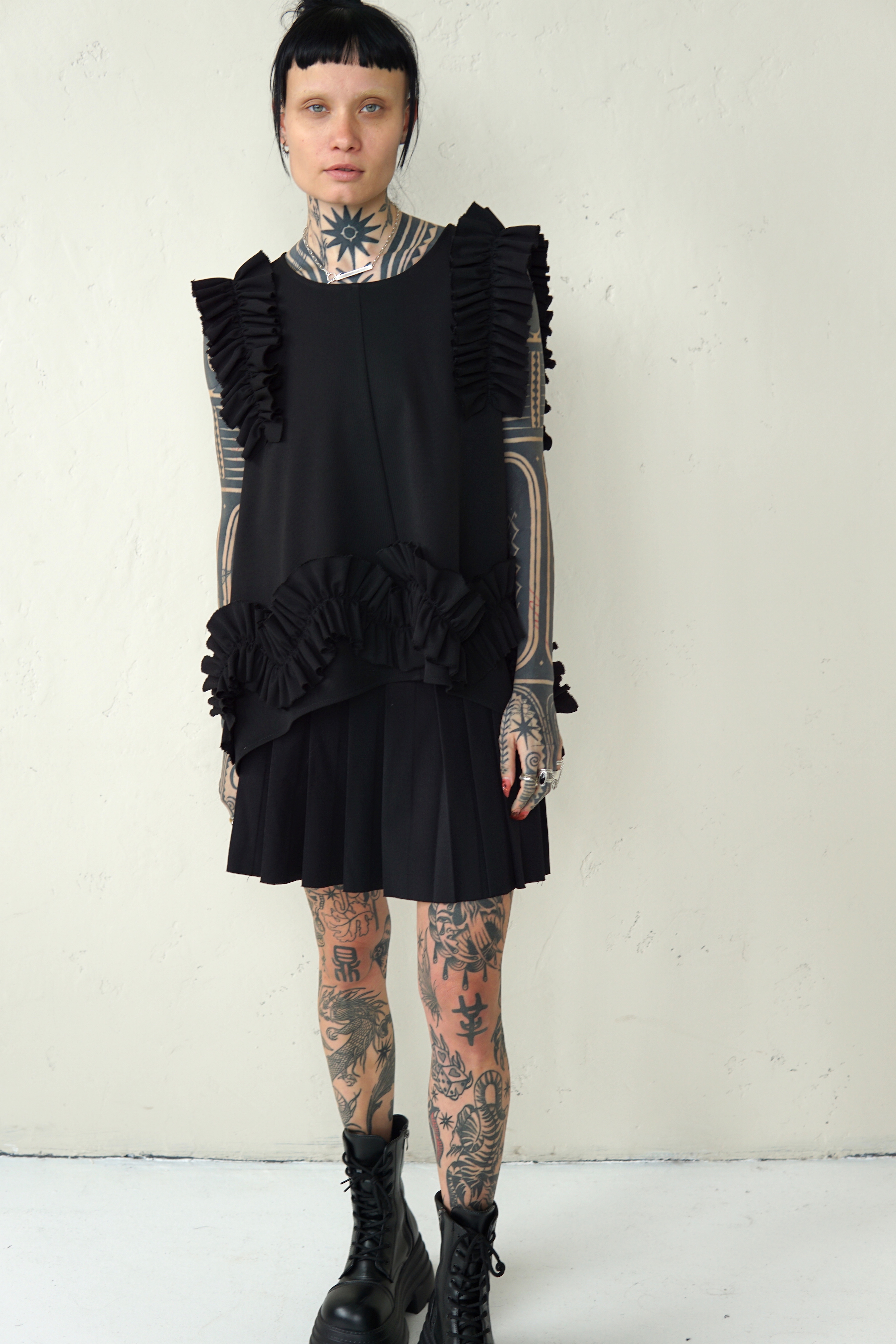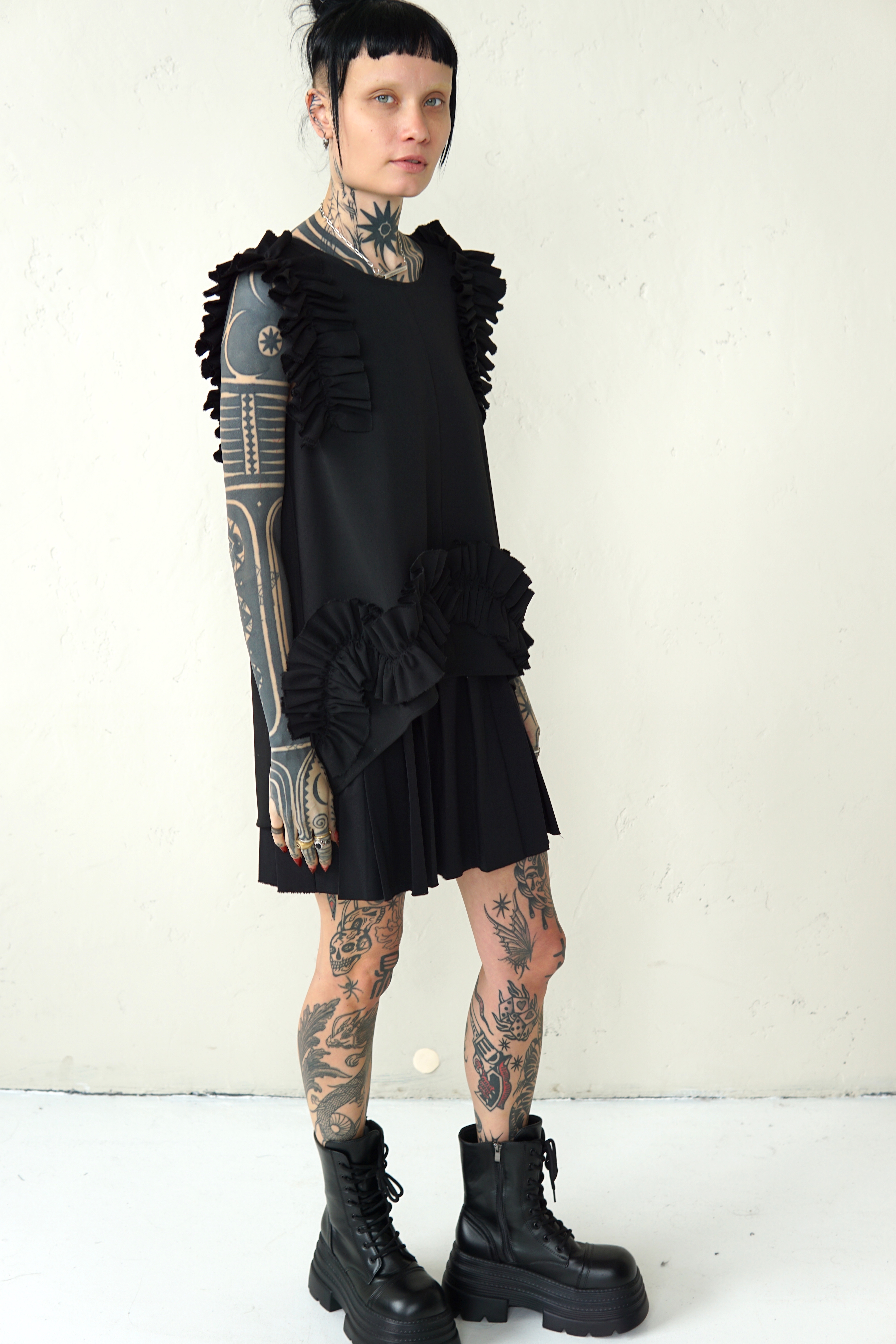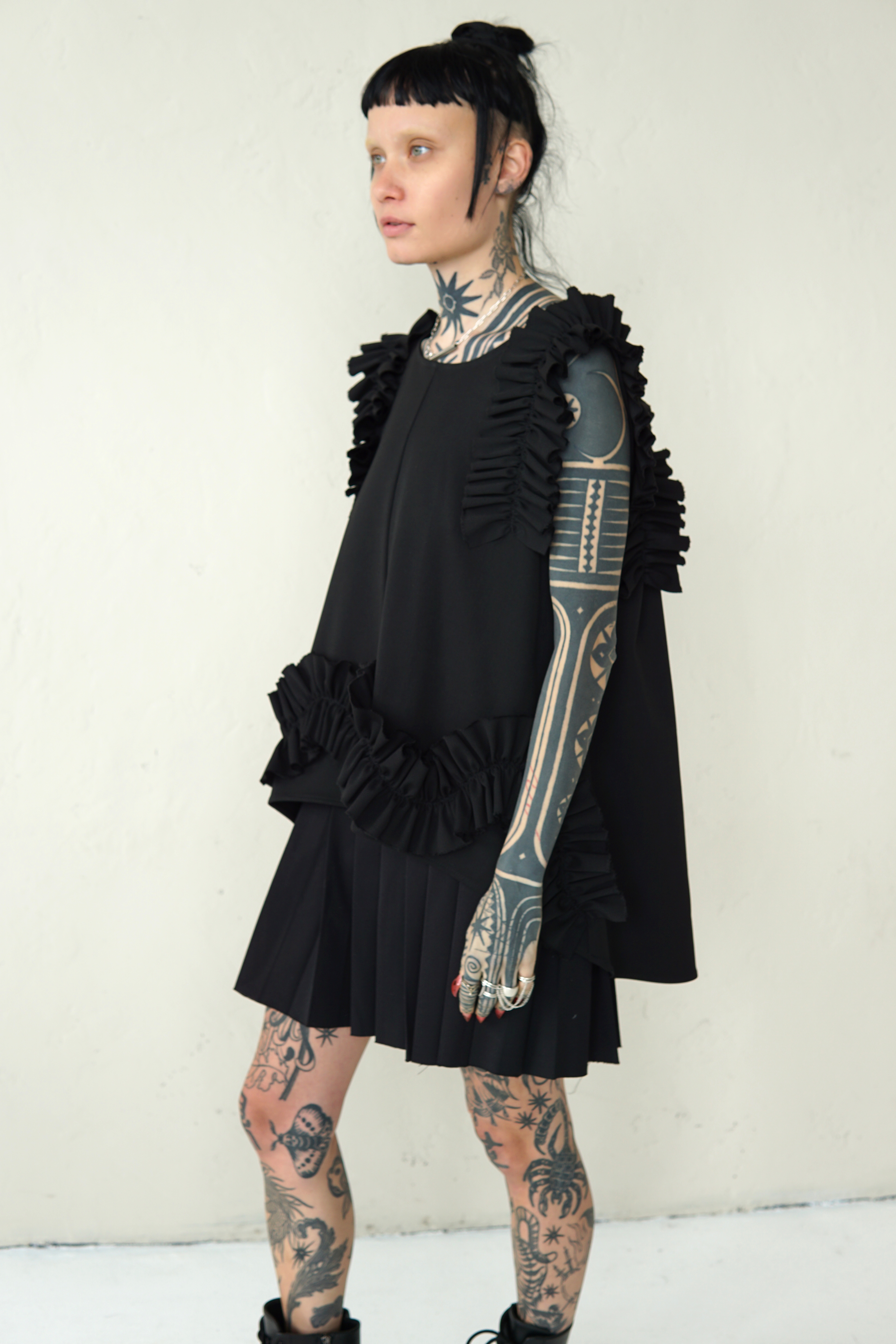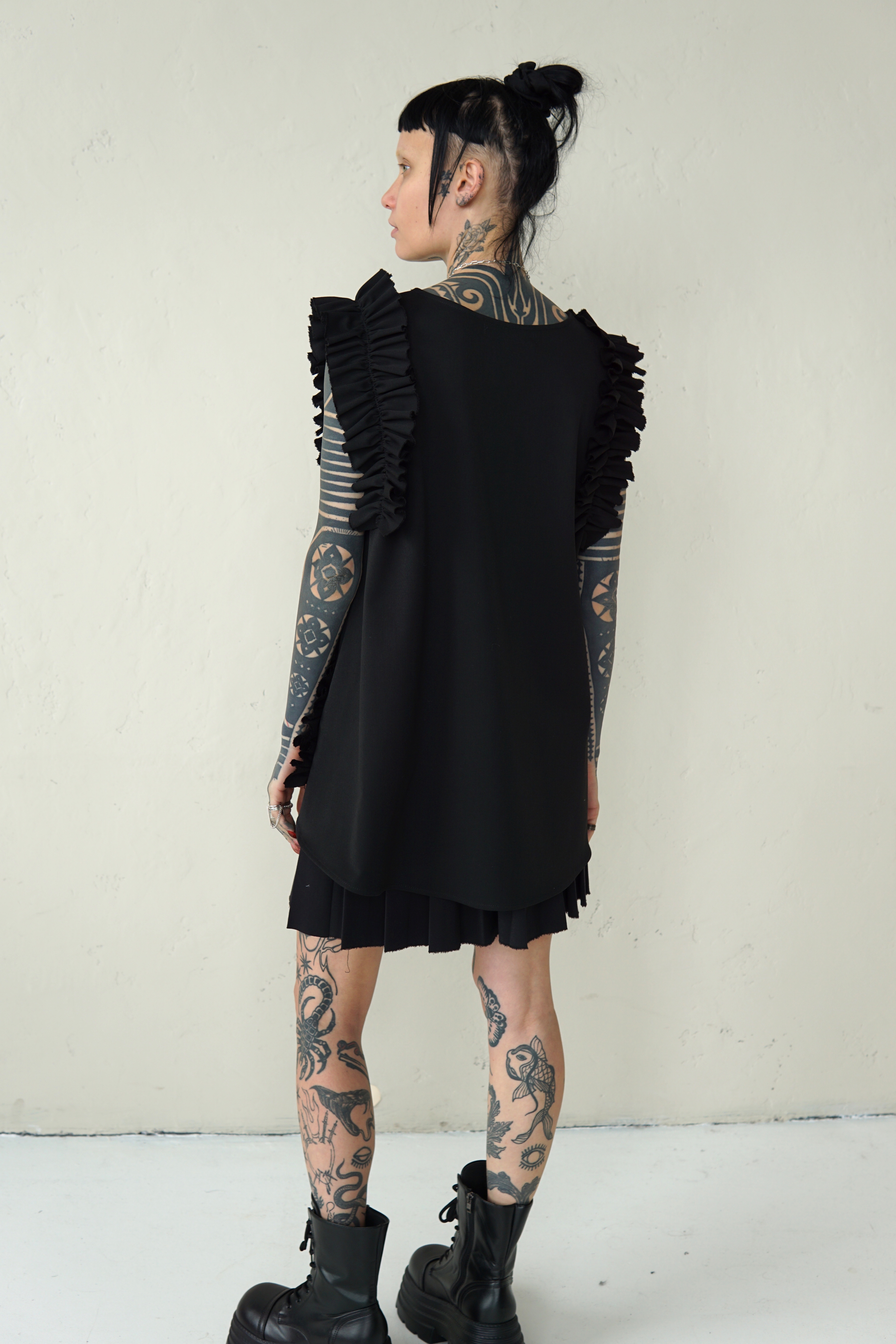 BLACK WOOL BLOUSE WITH RUFFLED DETAILS